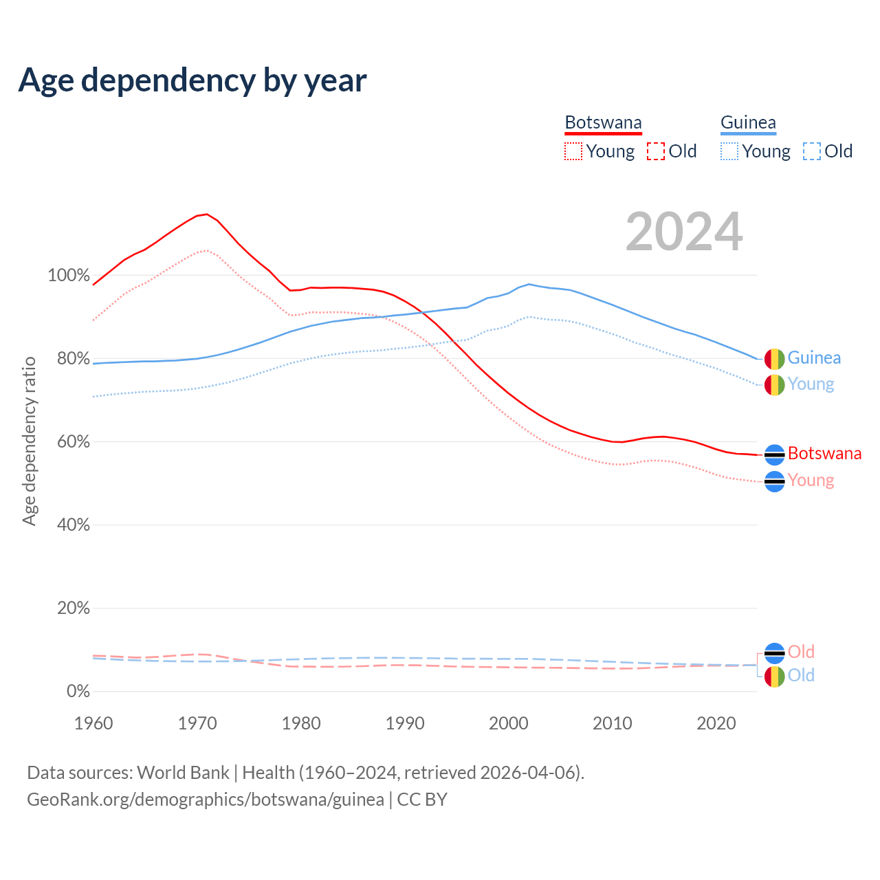 - The share of old-age demographic (65+) in Botswana is 4.04% vs 3.46% in Guinea.