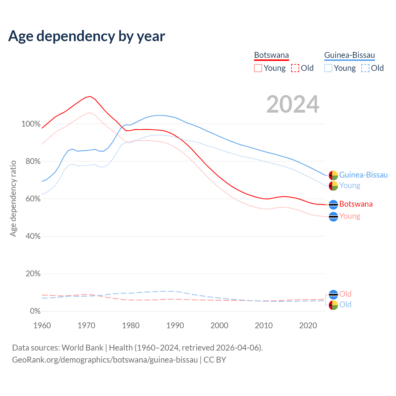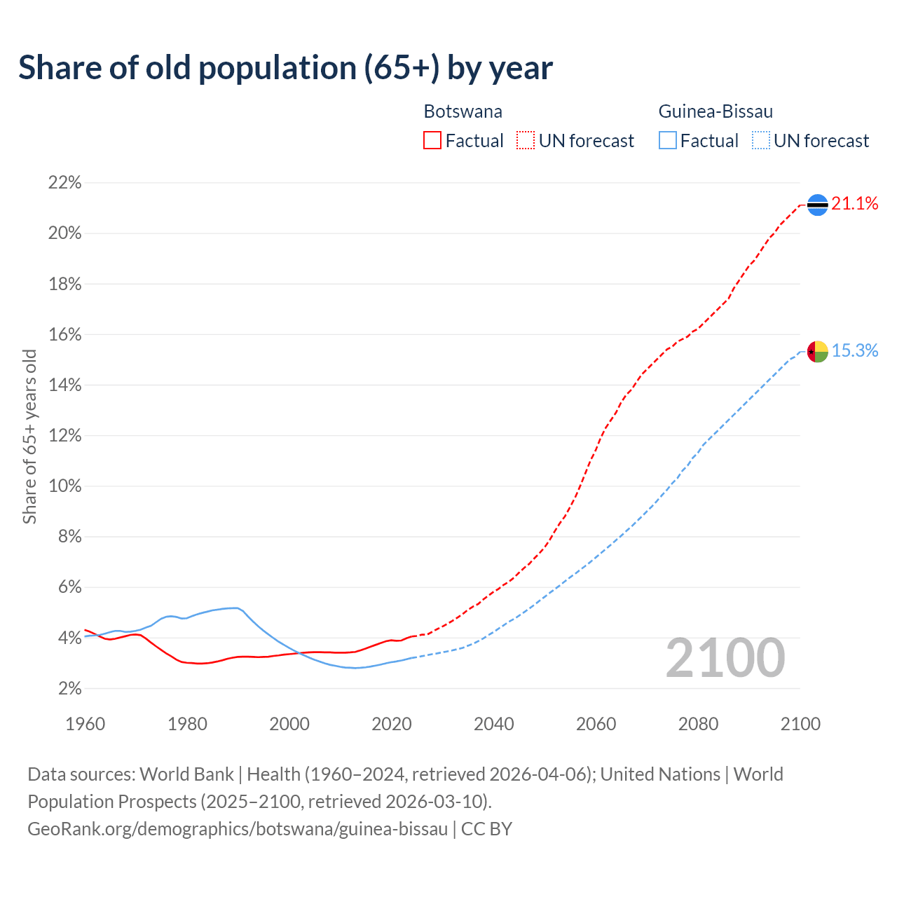 - The share of old-age demographic (65+) in Botswana is 4.04% vs 3.19% in Guinea-Bissau.