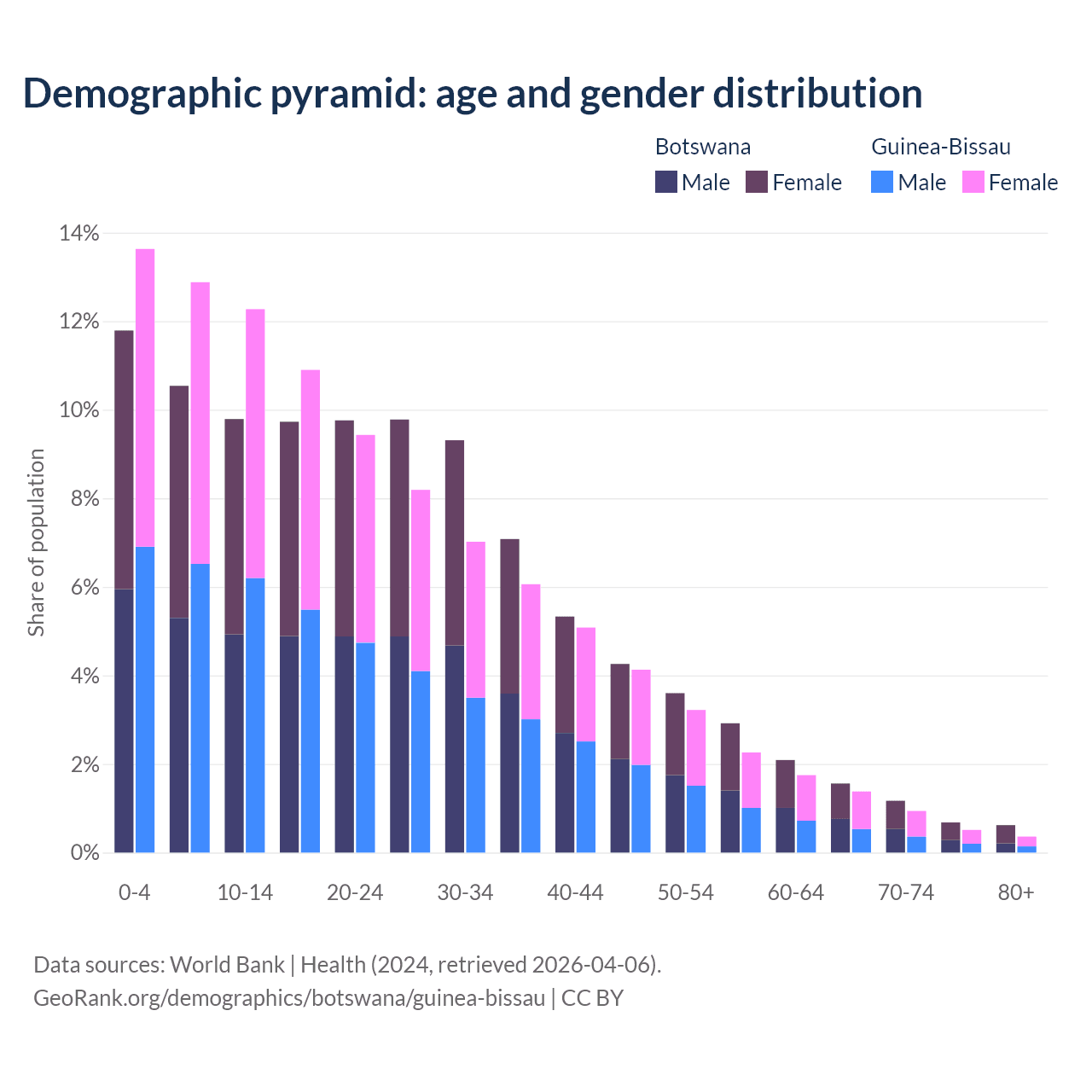- The share of young demographic (0-15 years old) in Botswana is 32.1% vs 38.8% in Guinea-Bissau.