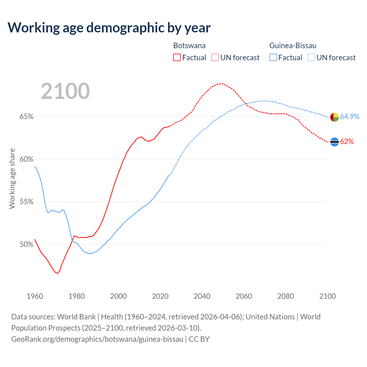 - Botswana has 1.67M working age adults (aged 15-64) vs 1.34M in Guinea-Bissau.