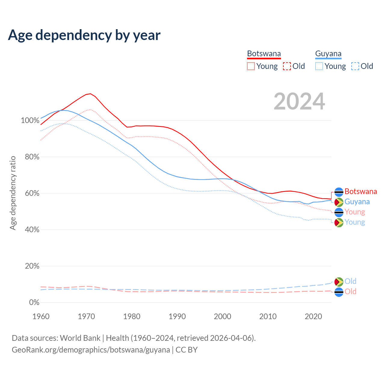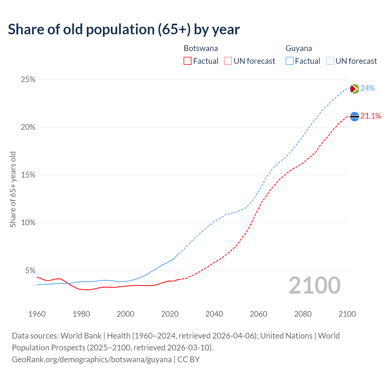 - The share of old-age demographic (65+) in Botswana is 4.04% vs 6.73% in Guyana.