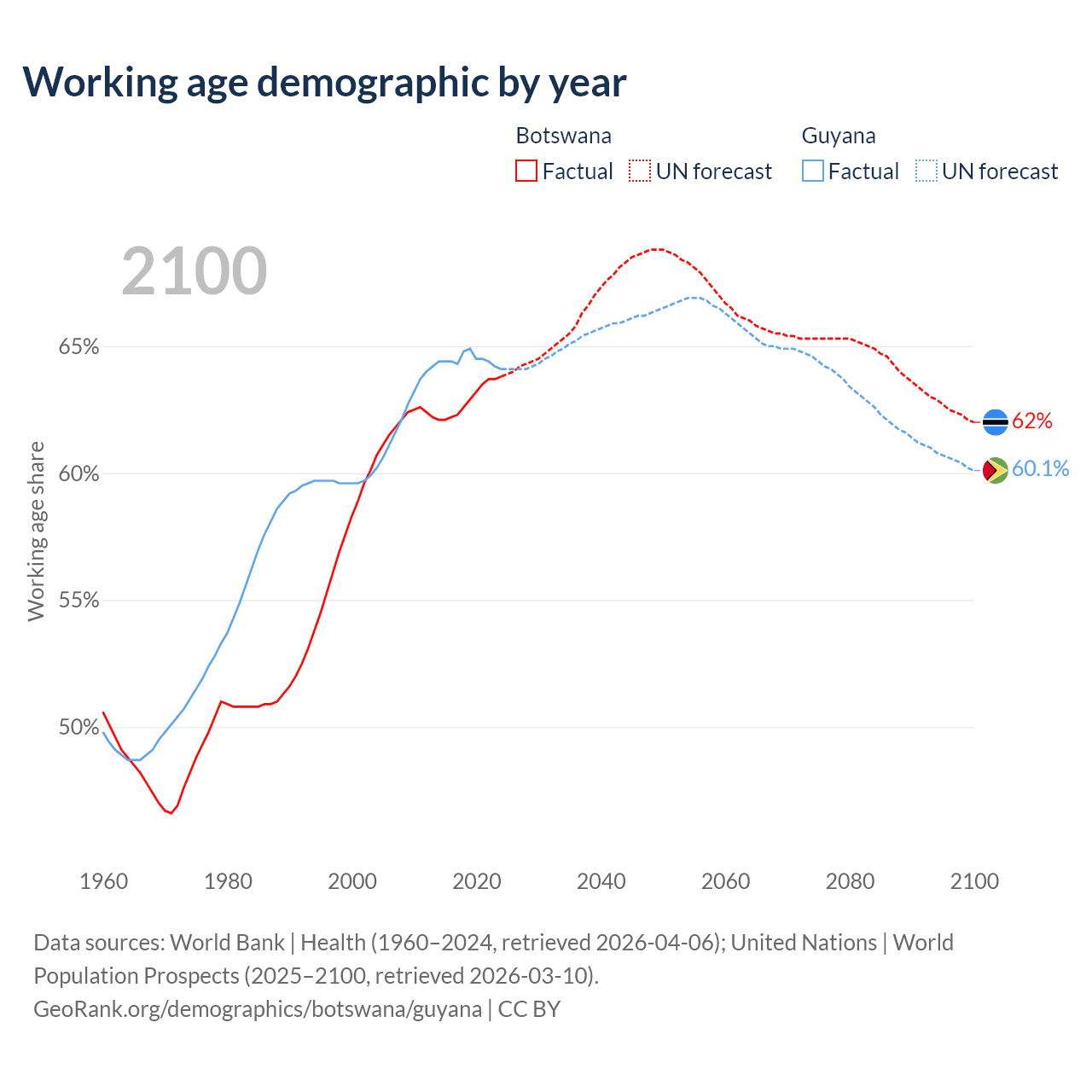 - Botswana has 1.67M working age adults (aged 15-64) vs 540K in Guyana.