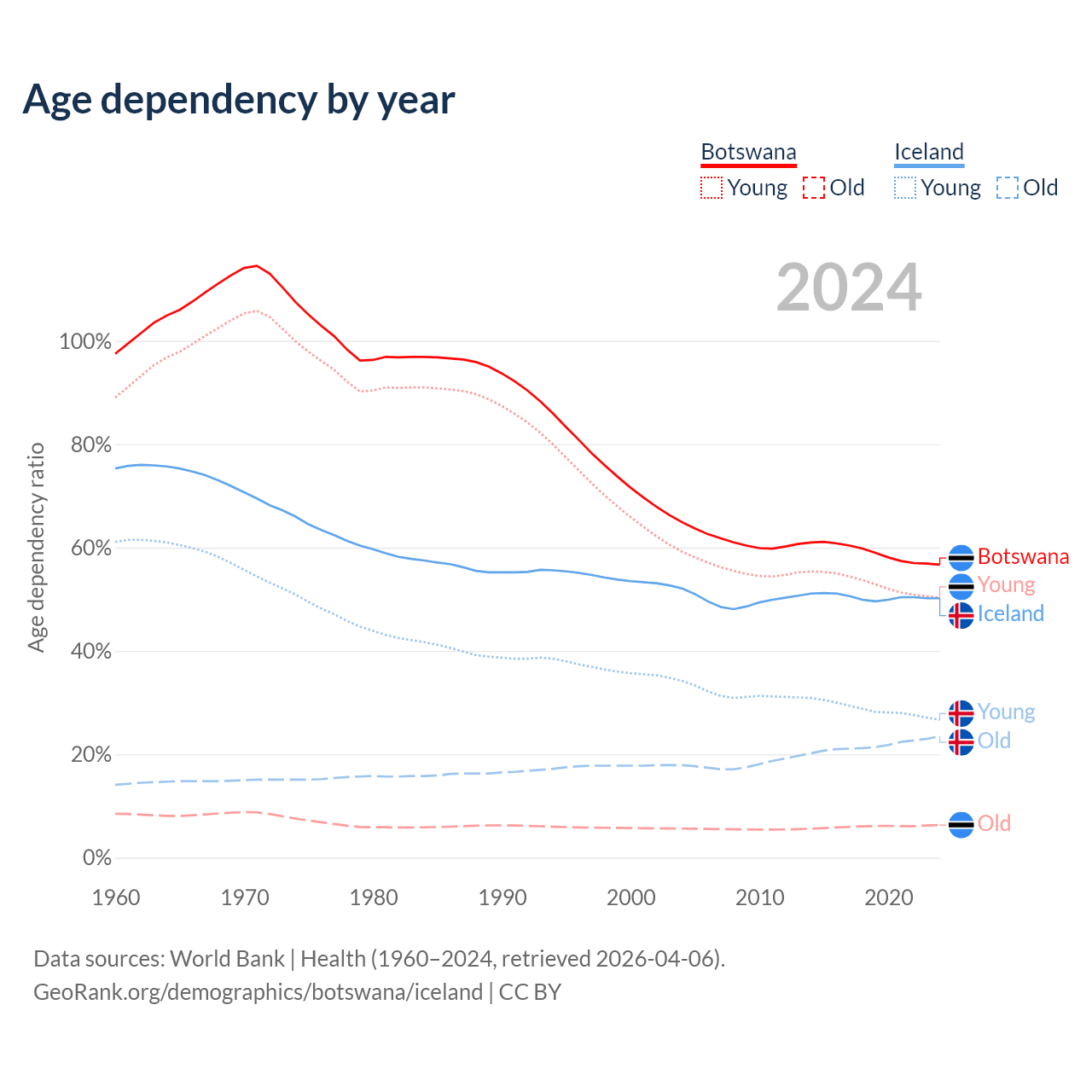 - The share of old-age demographic (65+) in Botswana is 4.04% vs 15.6% in Iceland.