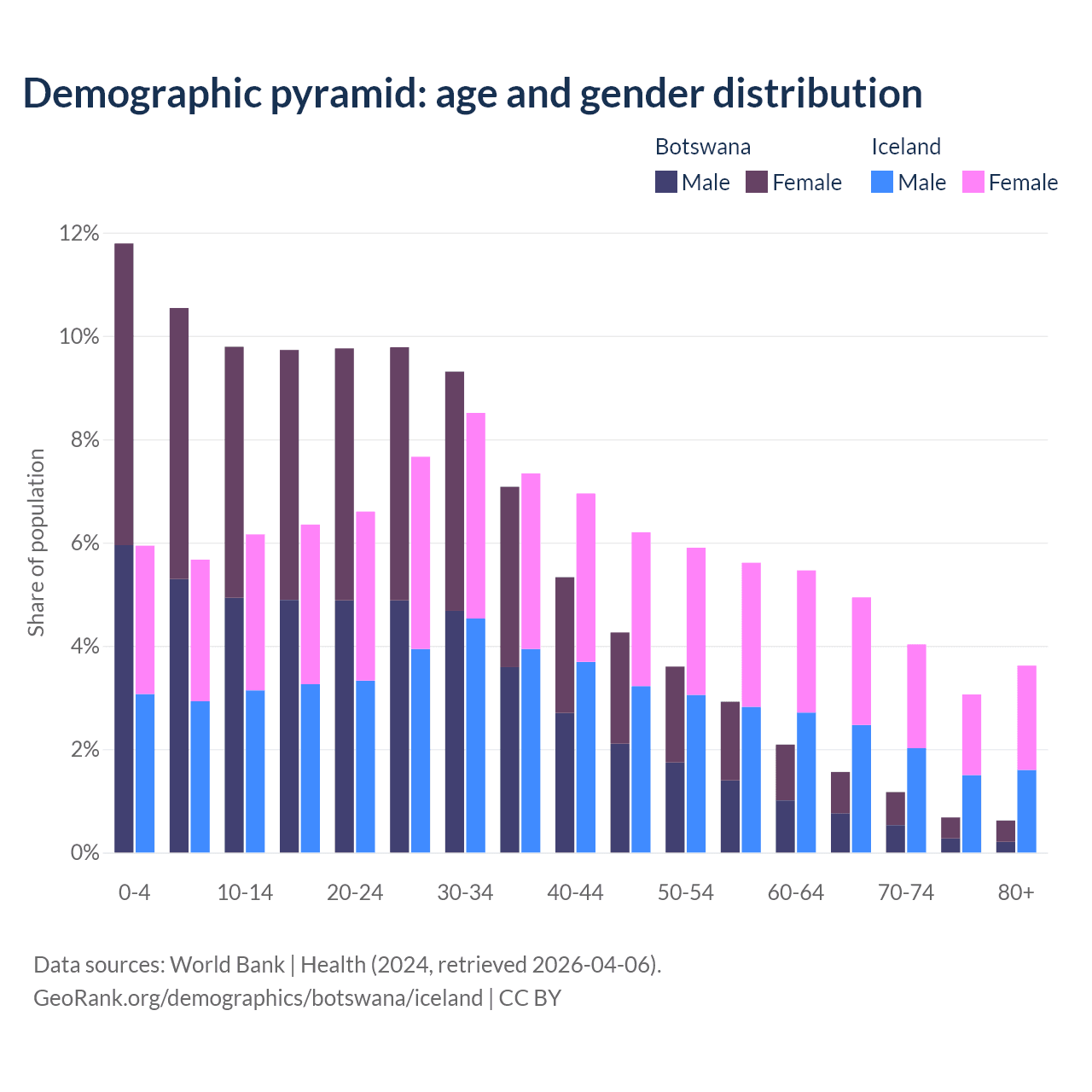 - As of 2026, the population of Botswana is 2.62M vs 397K in Iceland - 6.59 times difference.