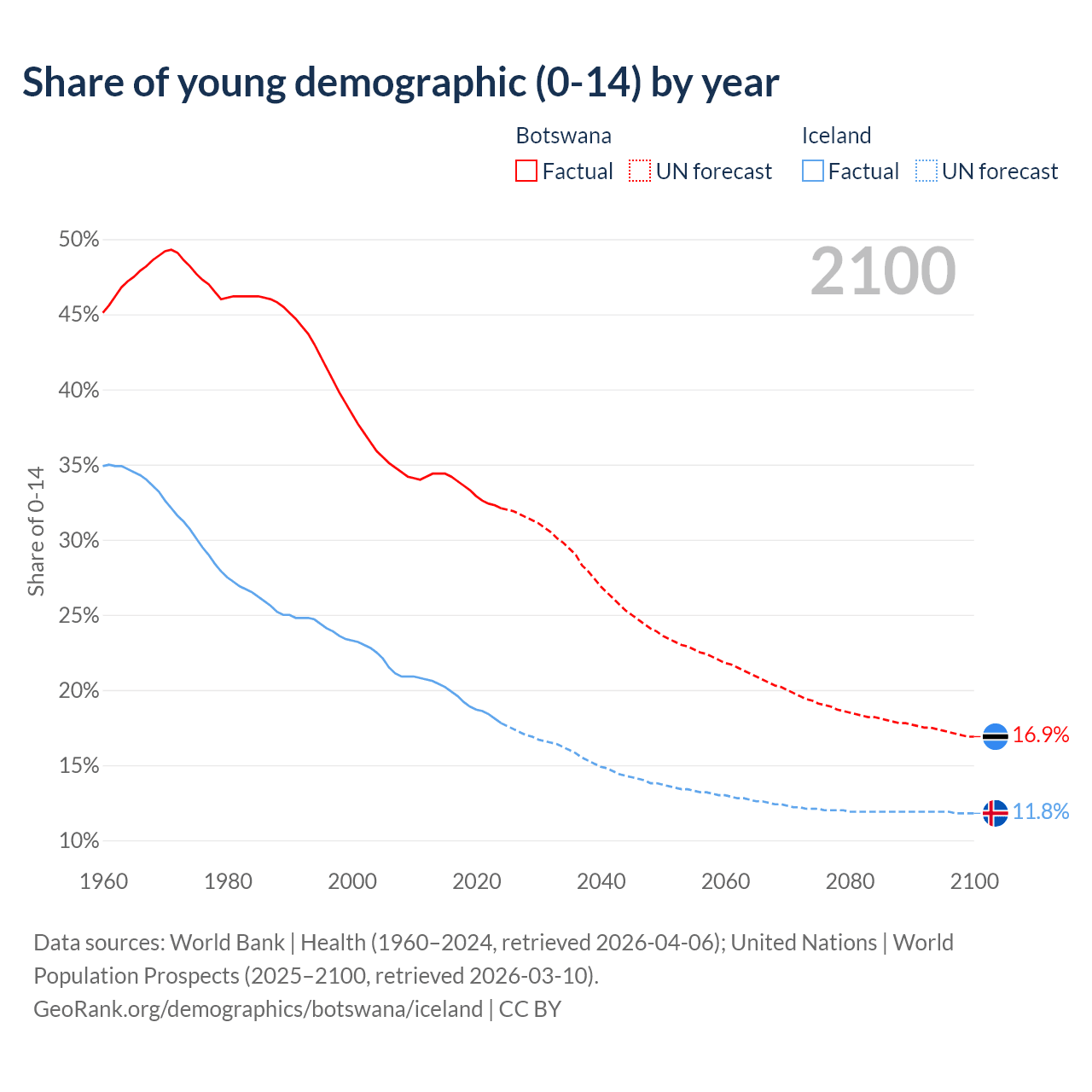 - The share of young demographic (0-15 years old) in Botswana is 32.1% vs 17.8% in Iceland.