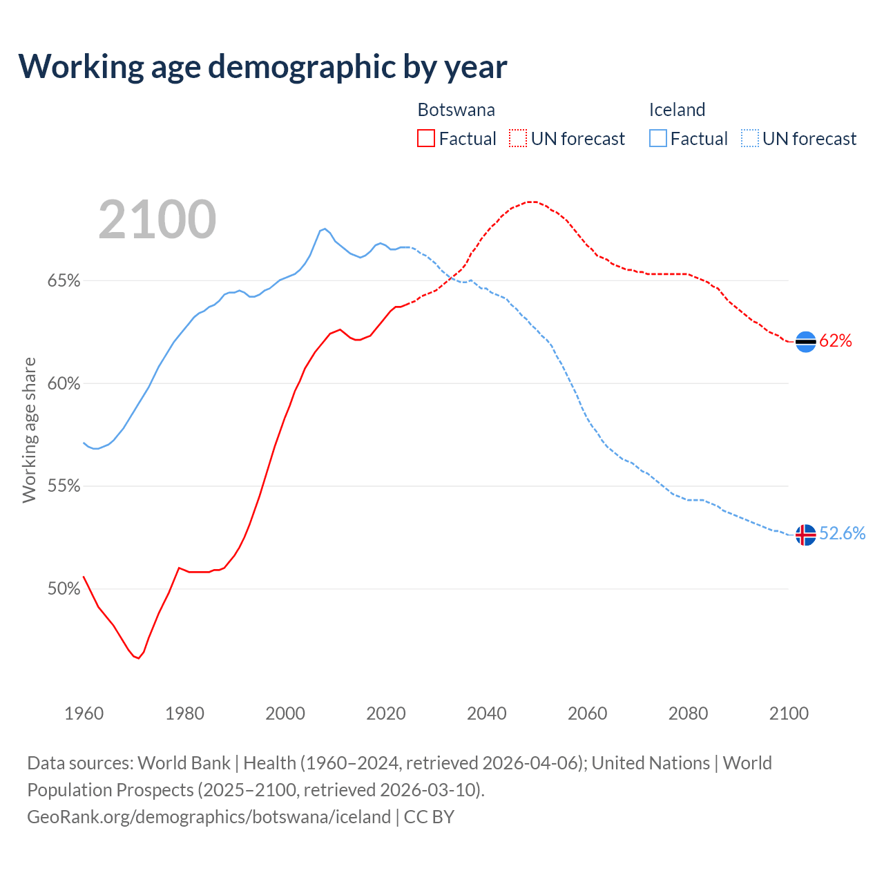 - Botswana has 1.67M working age adults (aged 15-64) vs 264K in Iceland.