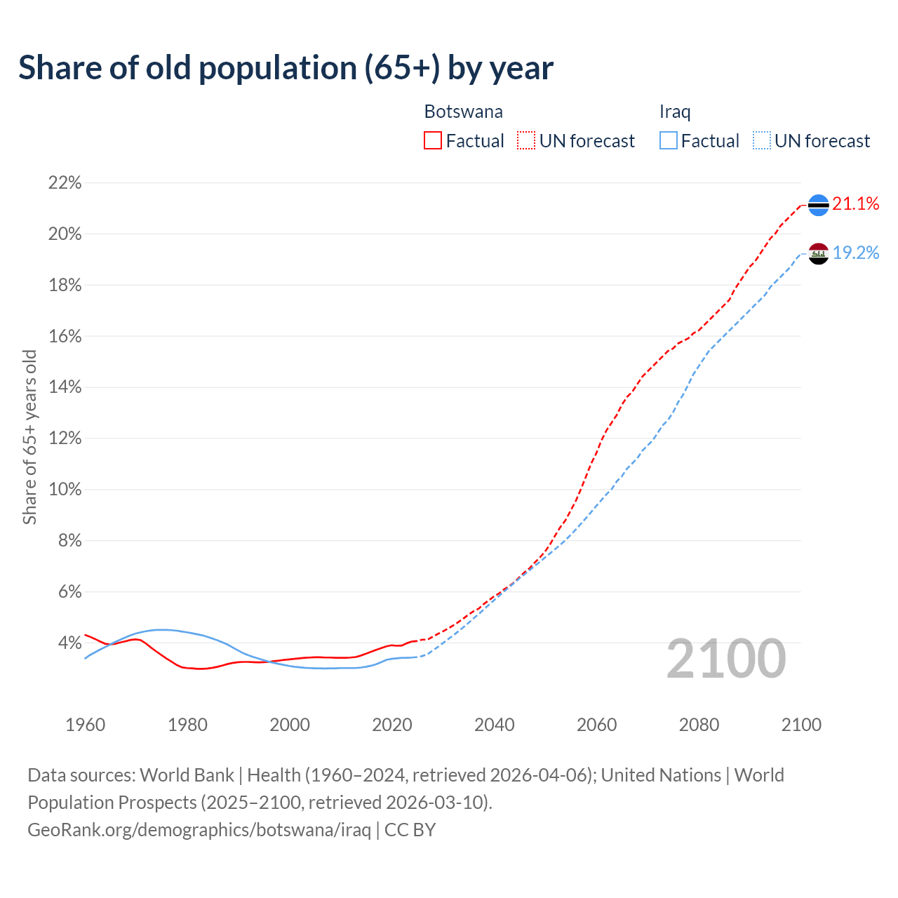 - The share of old-age demographic (65+) in Botswana is 4.04% vs 3.41% in Iraq.