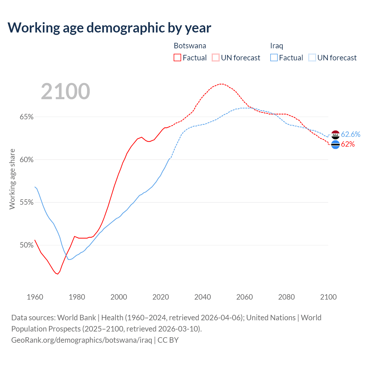 Median age Botswana vs Iraq, 1960-2100