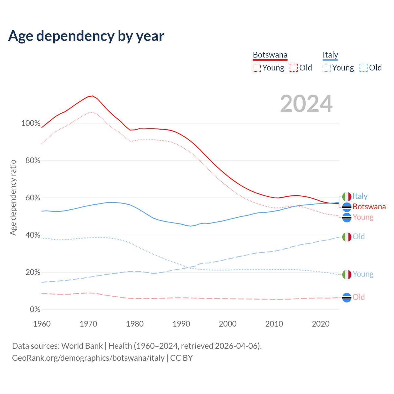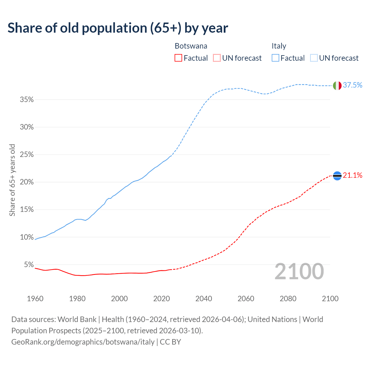 The share of older people aged 65 and over is 4.04% in Botswana and 24.6% in Italy. Life expectancy in Botswana compared to Italy .