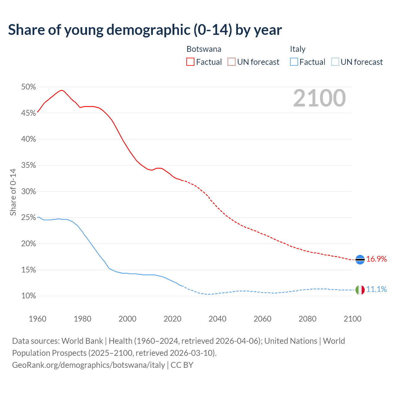 - The share of young demographic (0-15 years old) in Botswana is 32.1% vs 11.9% in Italy.