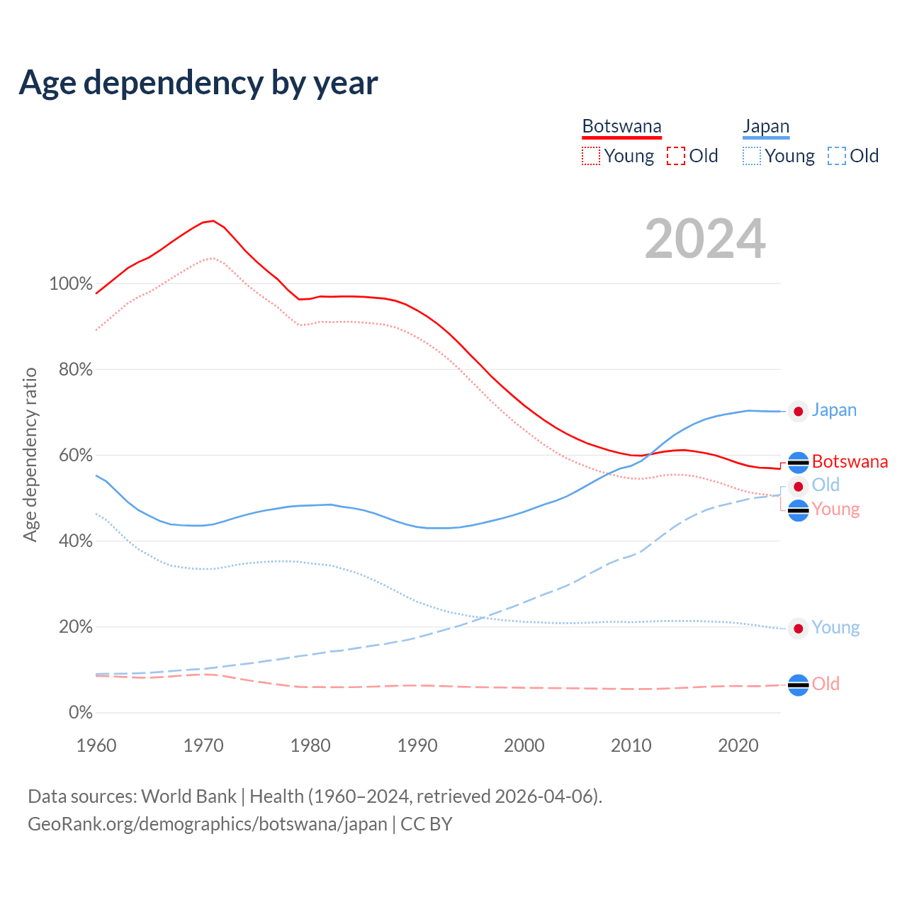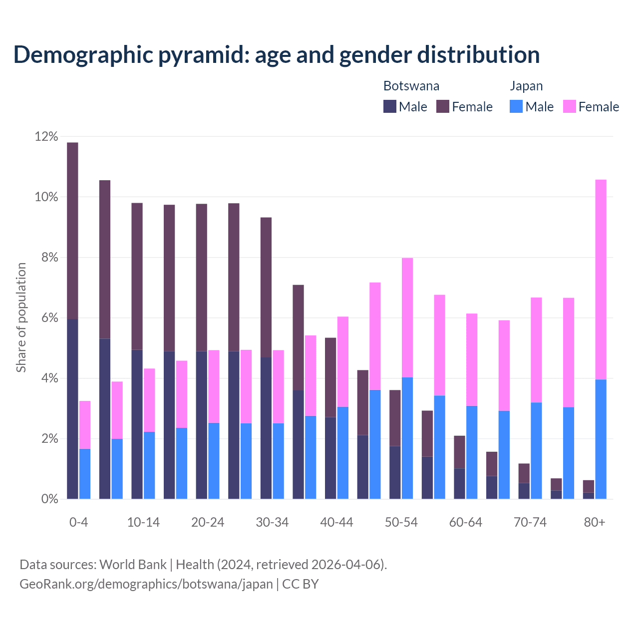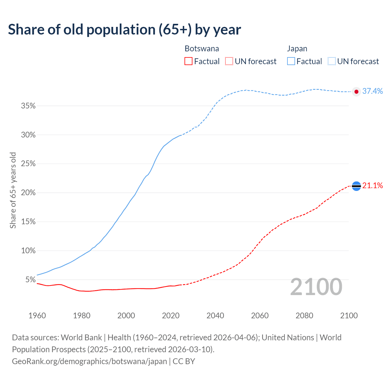 The share of older people aged 65 and over is 4.04% in Botswana and 29.8% in Japan. Life expectancy in Botswana compared to Japan .