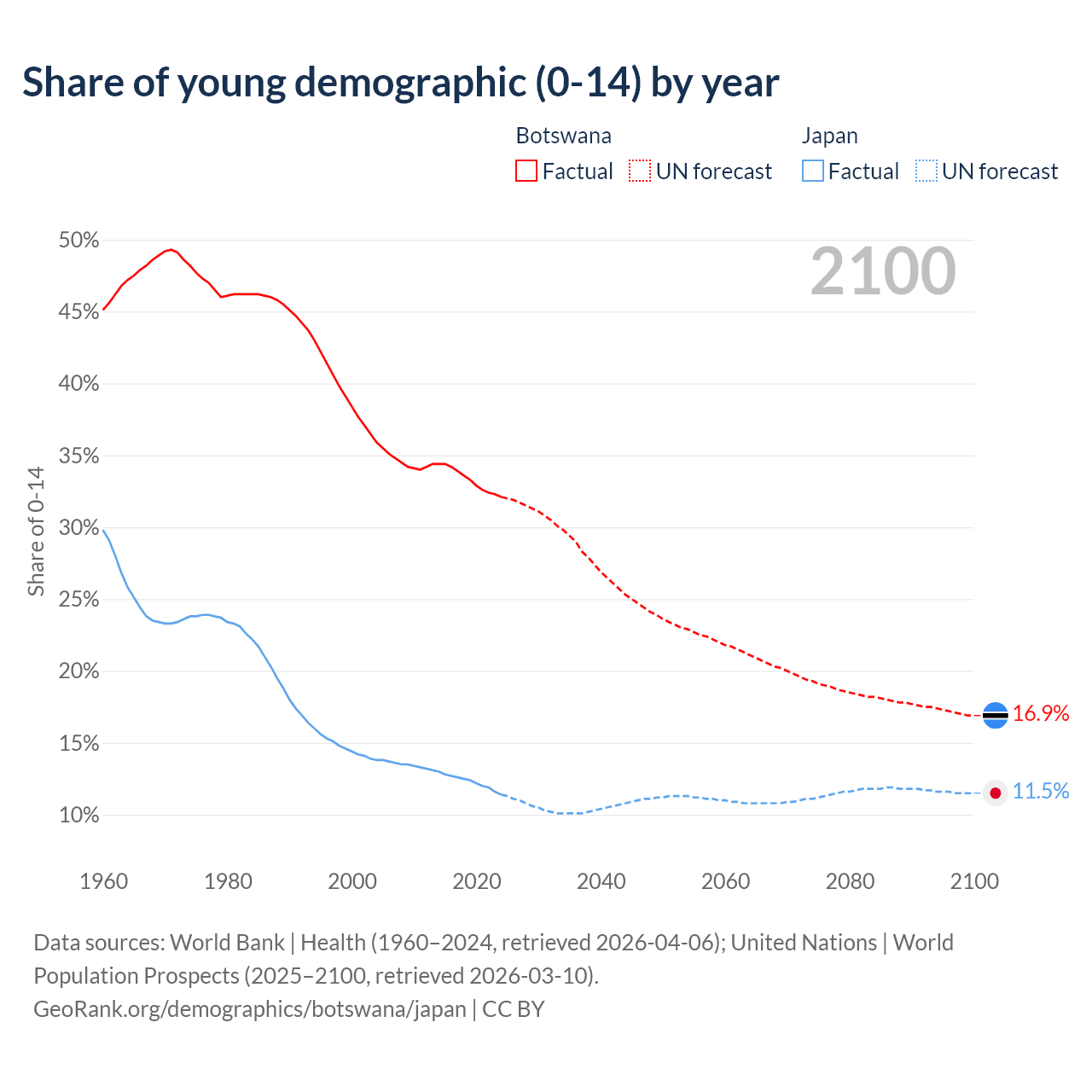 - The share of young demographic (0-15 years old) in Botswana is 32.1% vs 11.4% in Japan.