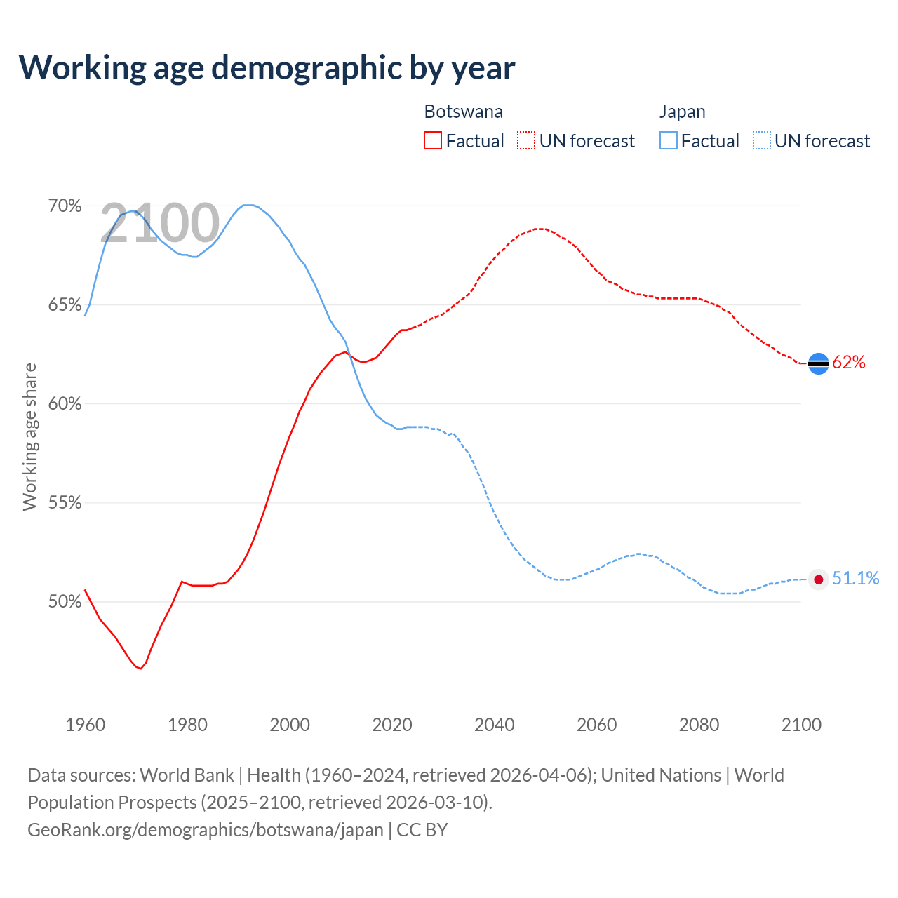 - Botswana has 1.67M working age adults (aged 15-64) vs 72.1M in Japan.