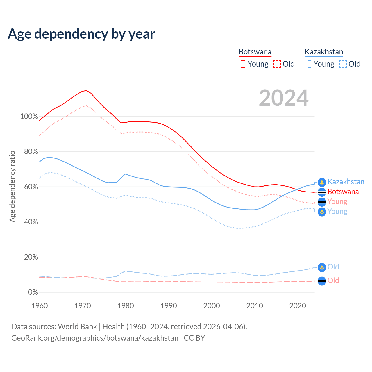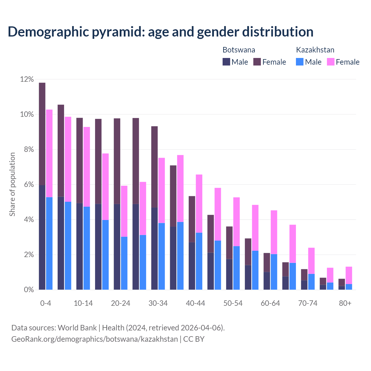- Botswana is ranked 136/196 by median age (oldest to youngest) vs 99/196 for Kazakhstan.