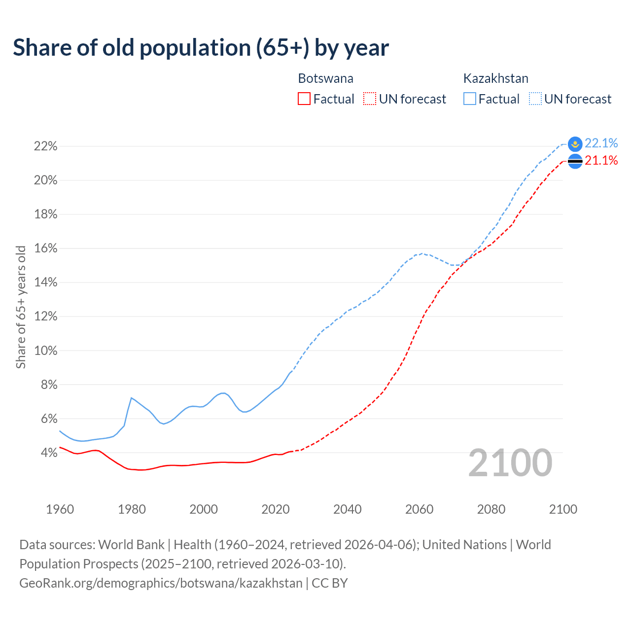 The share of older people aged 65 and over is 4.04% in Botswana and 8.65% in Kazakhstan. Life expectancy in Botswana compared to Kazakhstan .