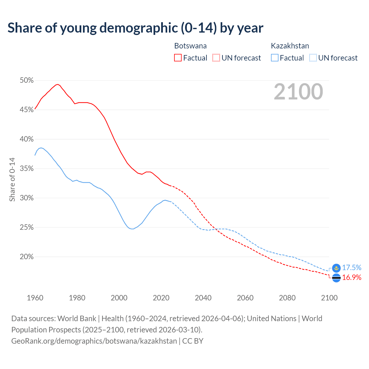 - The share of young demographic (0-15 years old) in Botswana is 32.1% vs 29.4% in Kazakhstan.