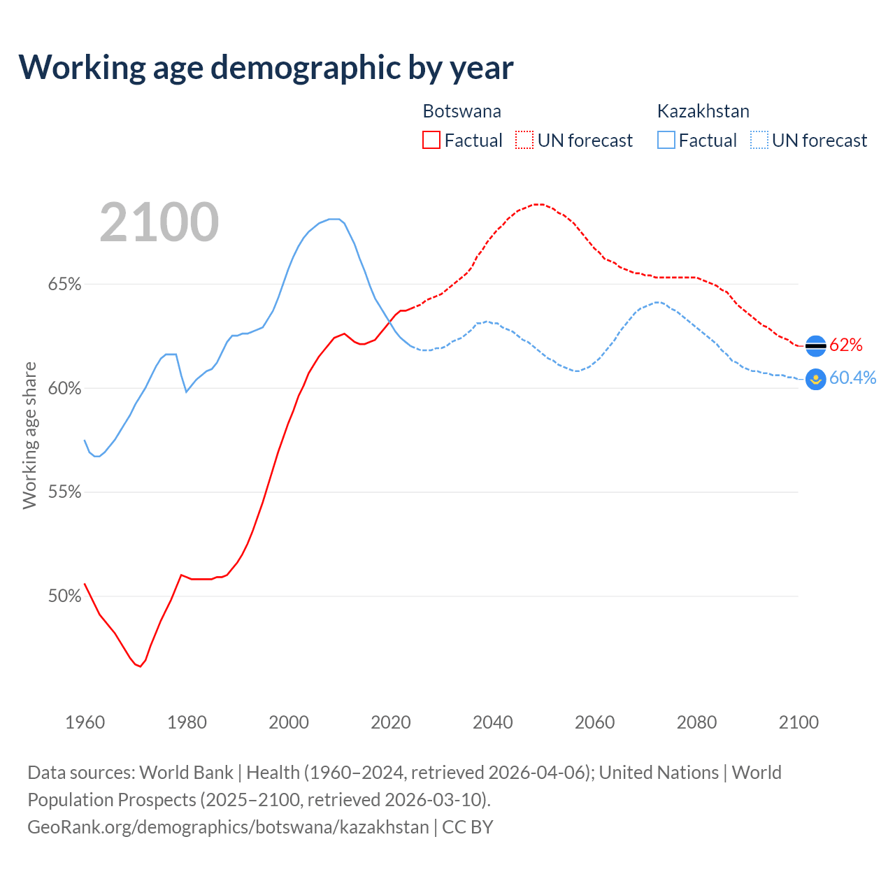 - Botswana has 1.67M working age adults (aged 15-64) vs 13.1M in Kazakhstan.