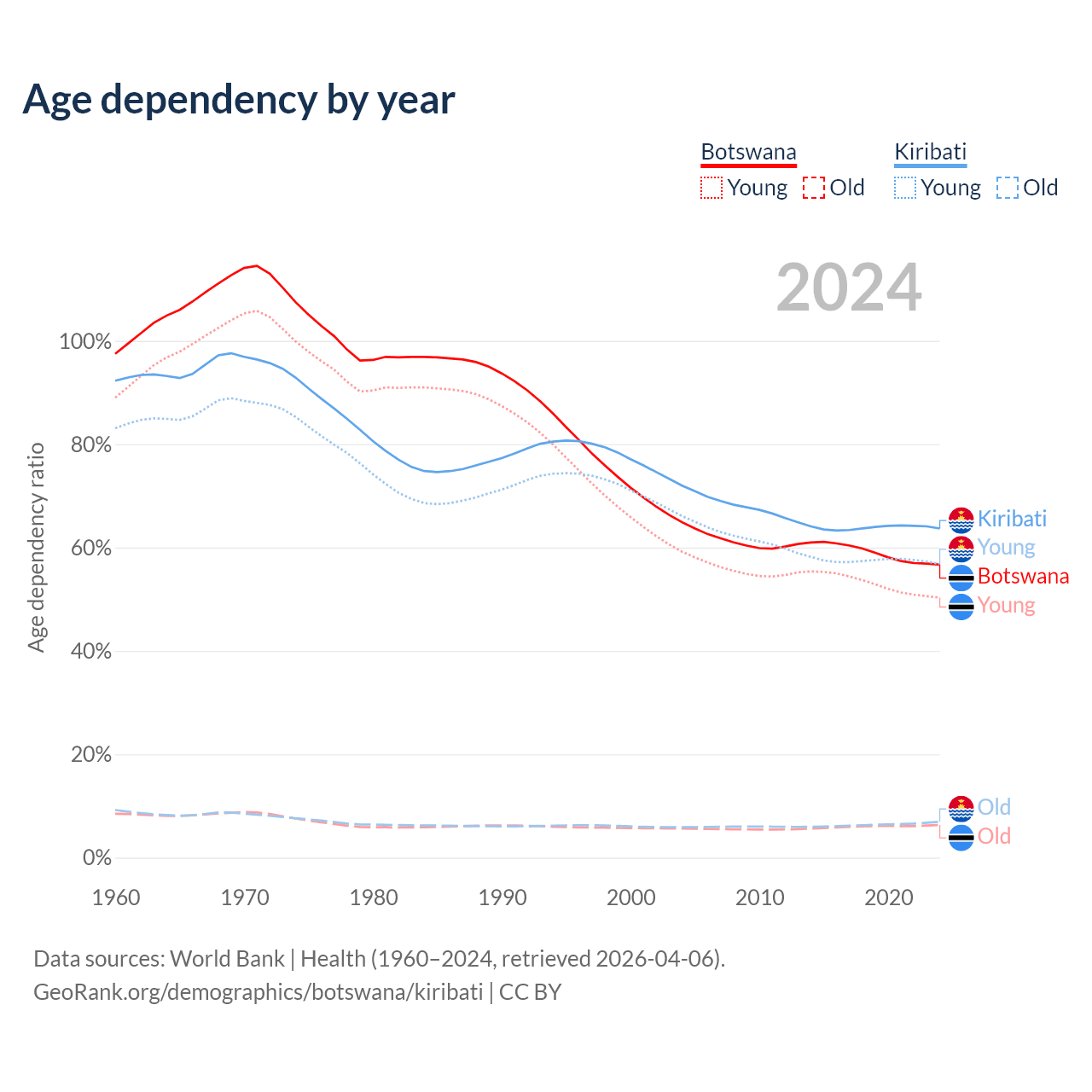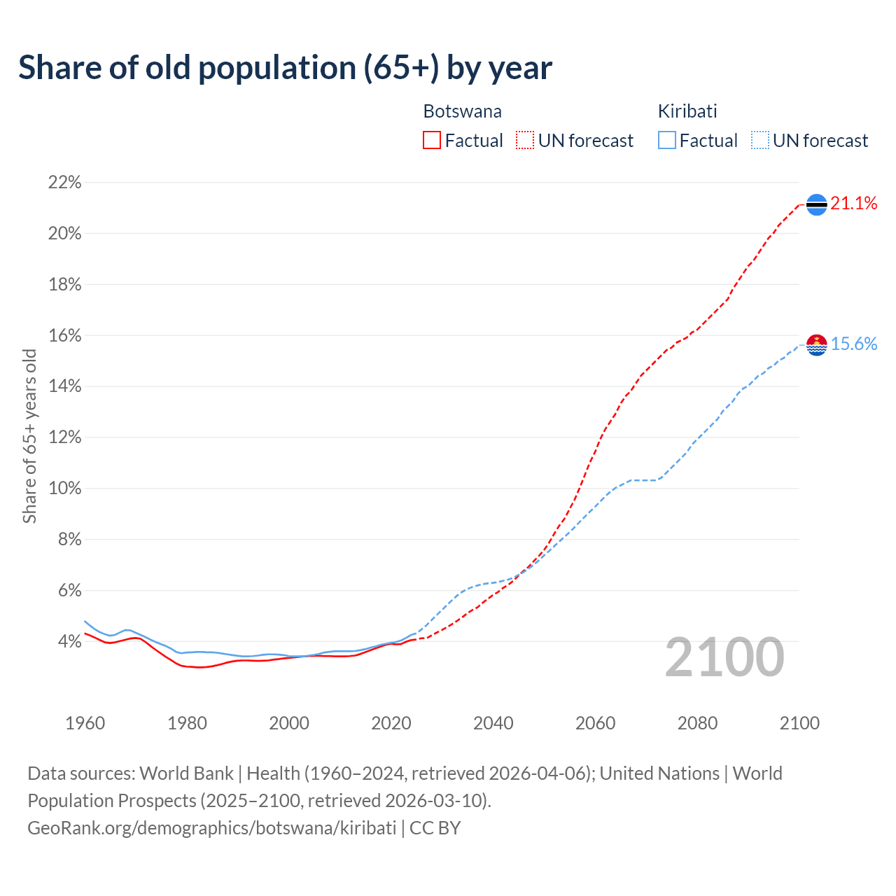 - The share of old-age demographic (65+) in Botswana is 4.04% vs 4.24% in Kiribati.