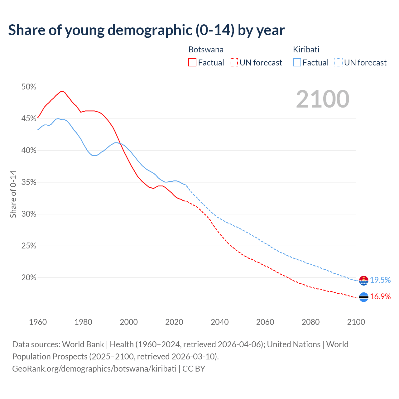 - The share of young demographic (0-15 years old) in Botswana is 32.1% vs 34.7% in Kiribati.