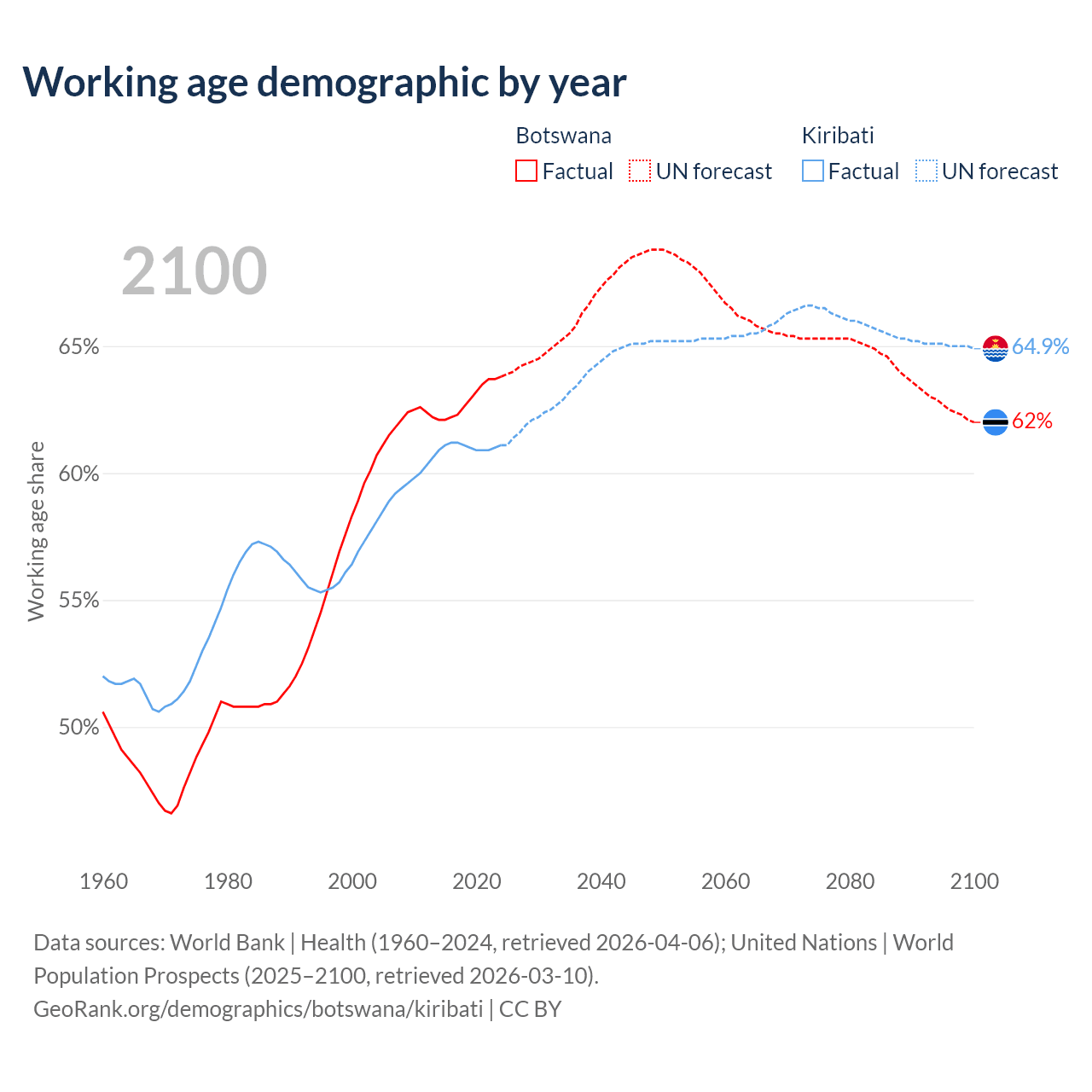 - Botswana has 1.67M working age adults (aged 15-64) vs 84.9K in Kiribati.