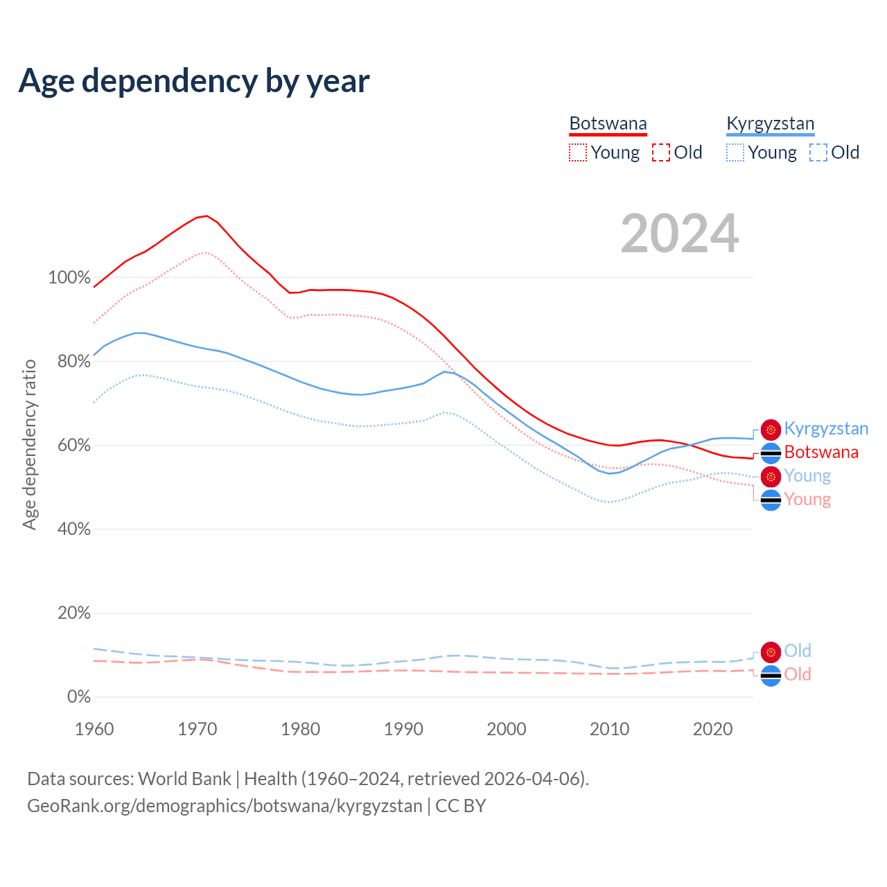 - The share of old-age demographic (65+) in Botswana is 4.04% vs 5.68% in Kyrgyzstan.
