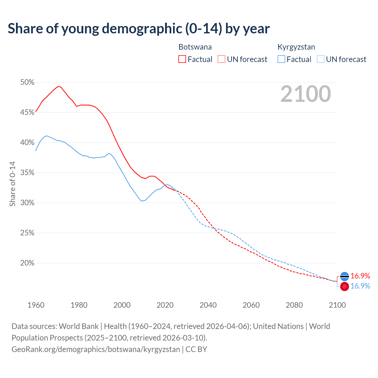 - The share of young demographic (0-15 years old) in Botswana is 32.1% vs 32.3% in Kyrgyzstan.