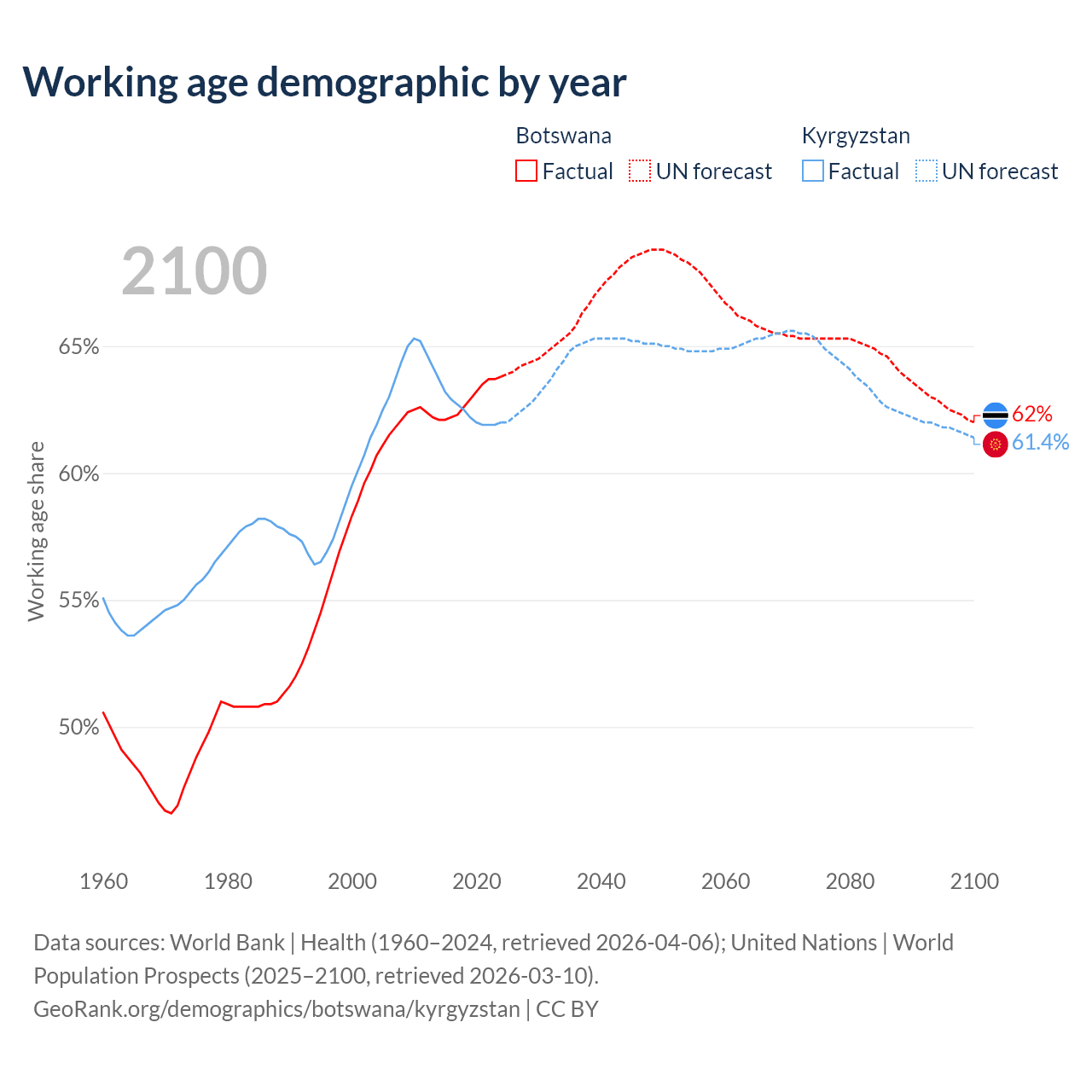 - Botswana has 1.67M working age adults (aged 15-64) vs 4.63M in Kyrgyzstan.