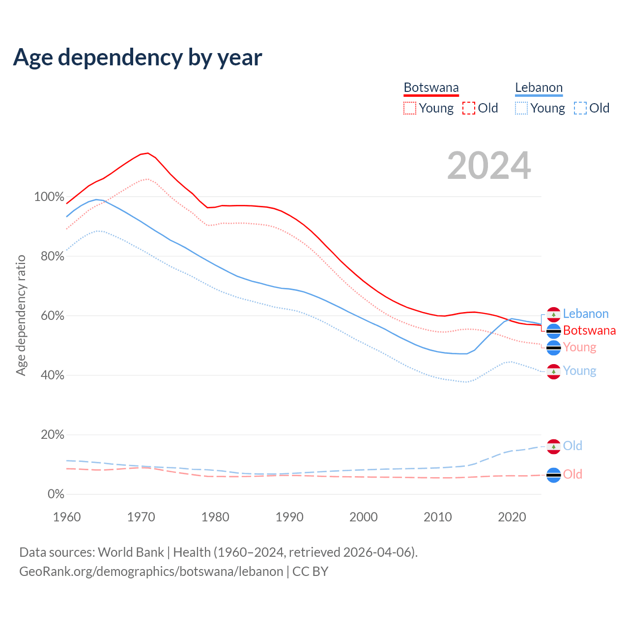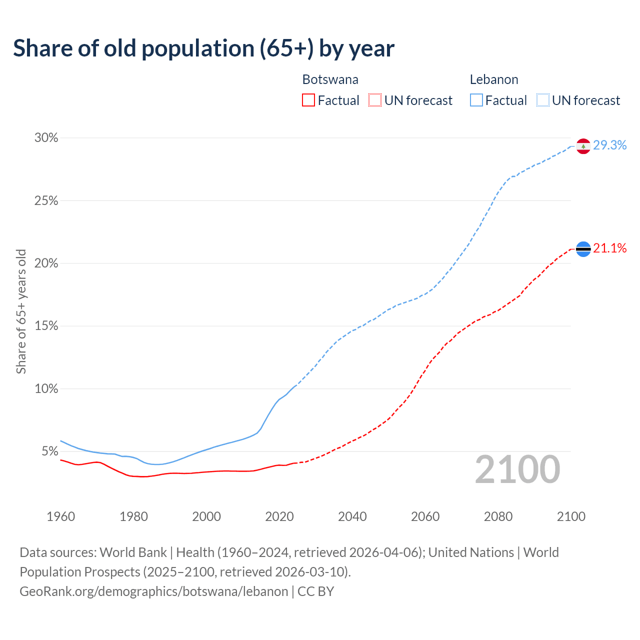 The share of older people aged 65 and over is 4.04% in Botswana and 10.1% in Lebanon. Life expectancy in Botswana compared to Lebanon .