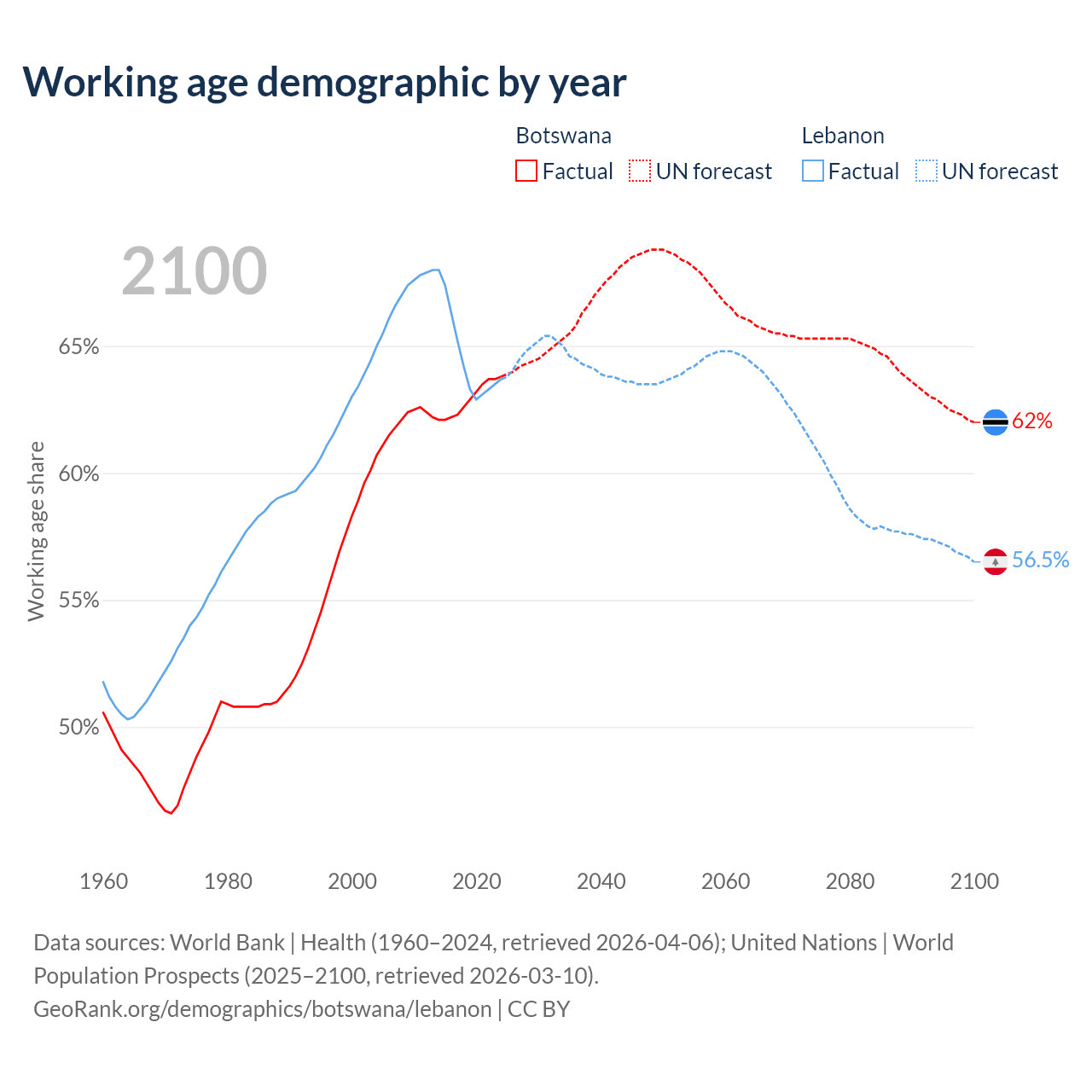 Median age Botswana vs Lebanon, 1960-2100