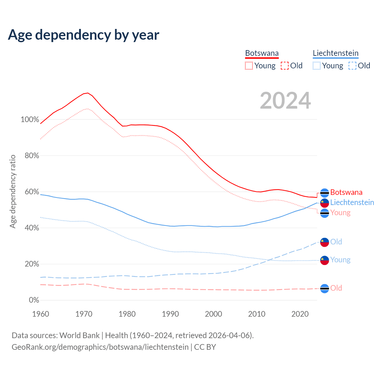 - The share of old-age demographic (65+) in Botswana is 4.04% vs 20.7% in Liechtenstein.