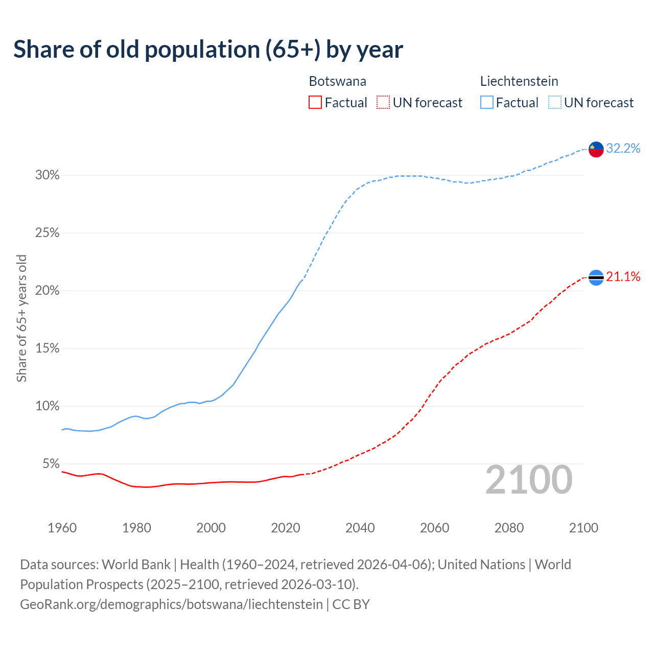 The share of older people aged 65 and over is 4.04% in Botswana and 20.7% in Liechtenstein. Life expectancy in Botswana compared to Liechtenstein .