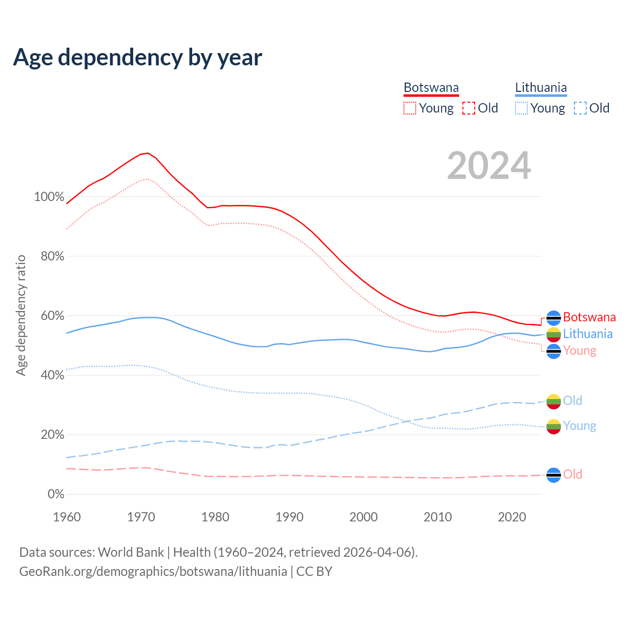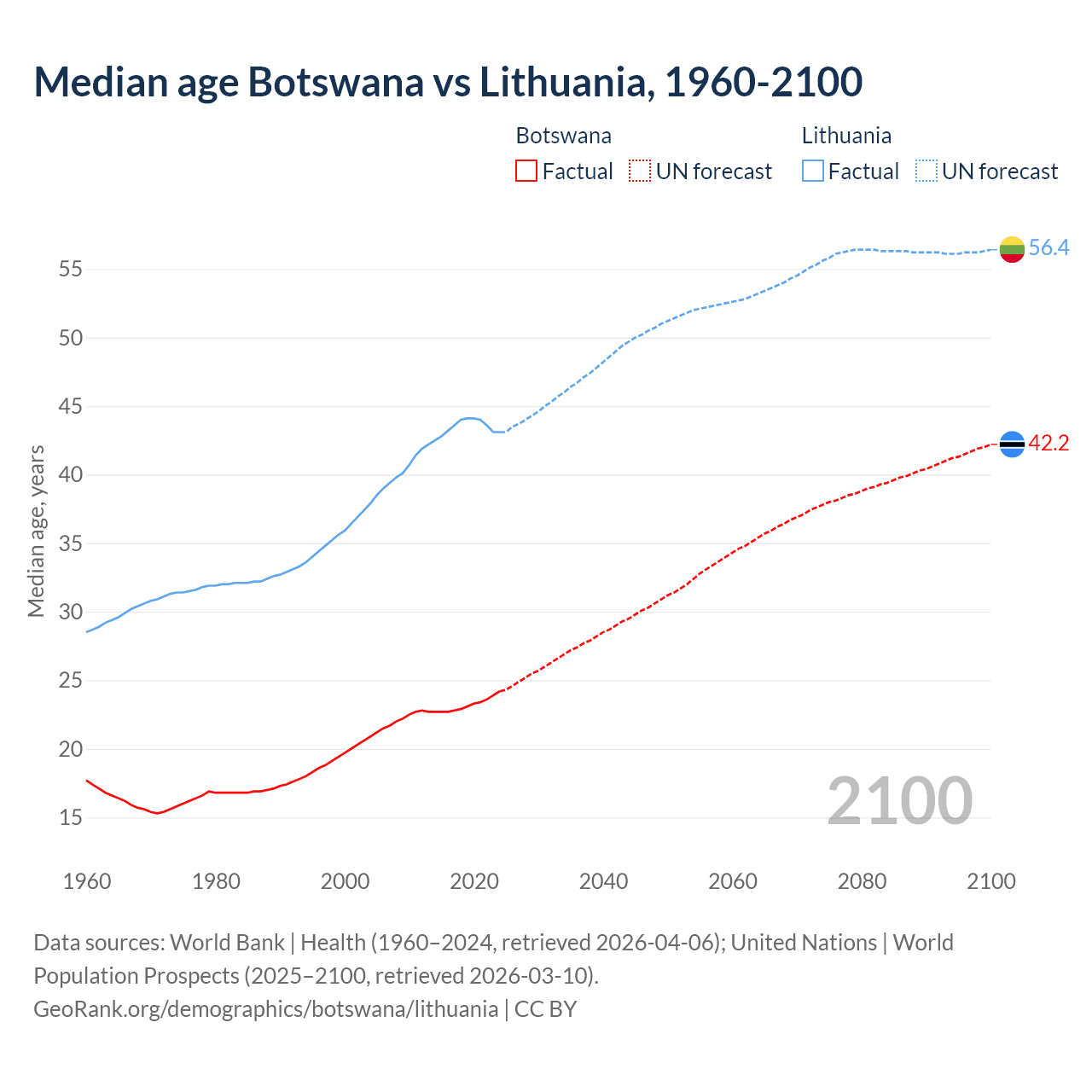 - Botswana is ranked 136/196 by median age (oldest to youngest) vs 28/196 for Lithuania.
