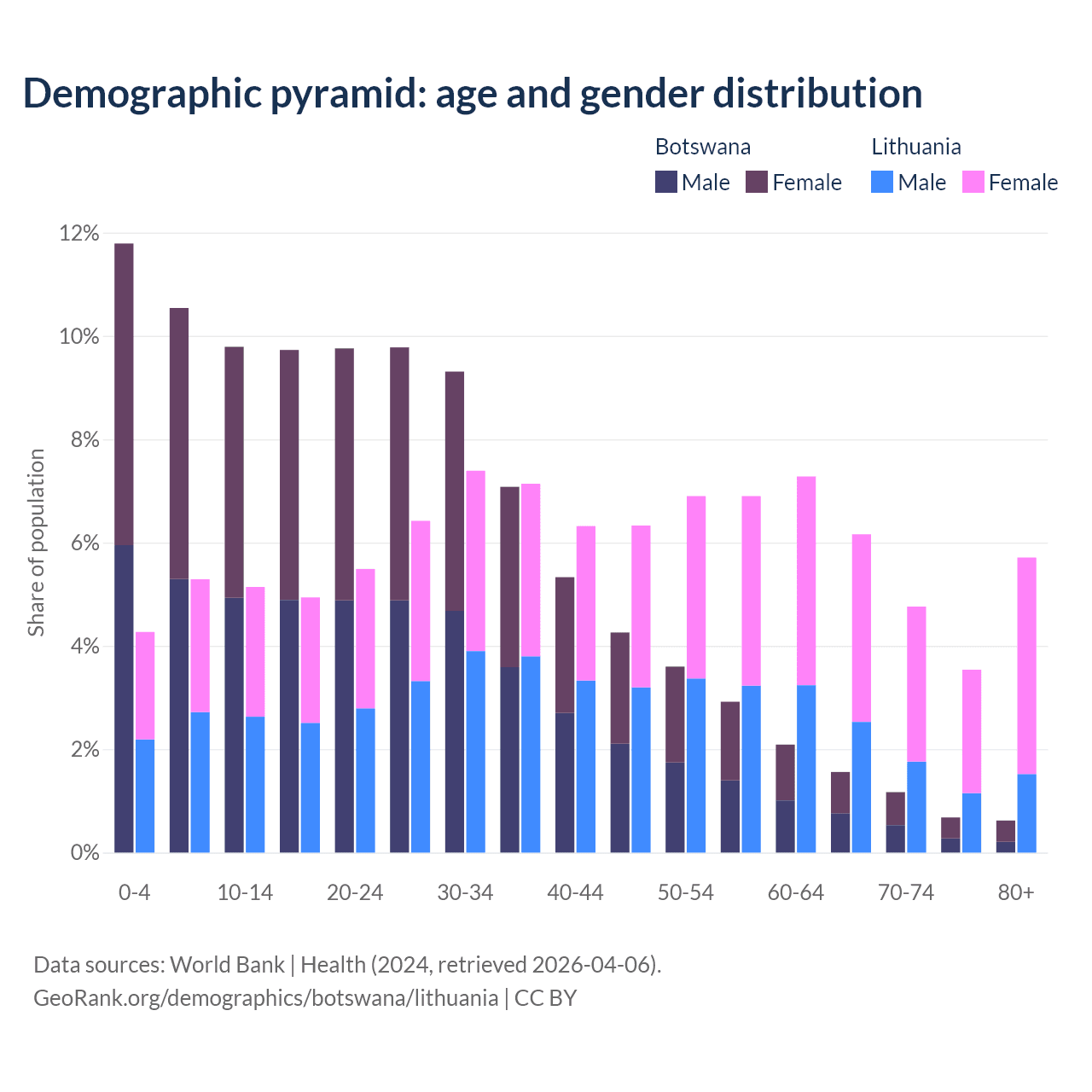 The share of older people aged 65 and over is 4.04% in Botswana and 20.2% in Lithuania. Life expectancy in Botswana compared to Lithuania .