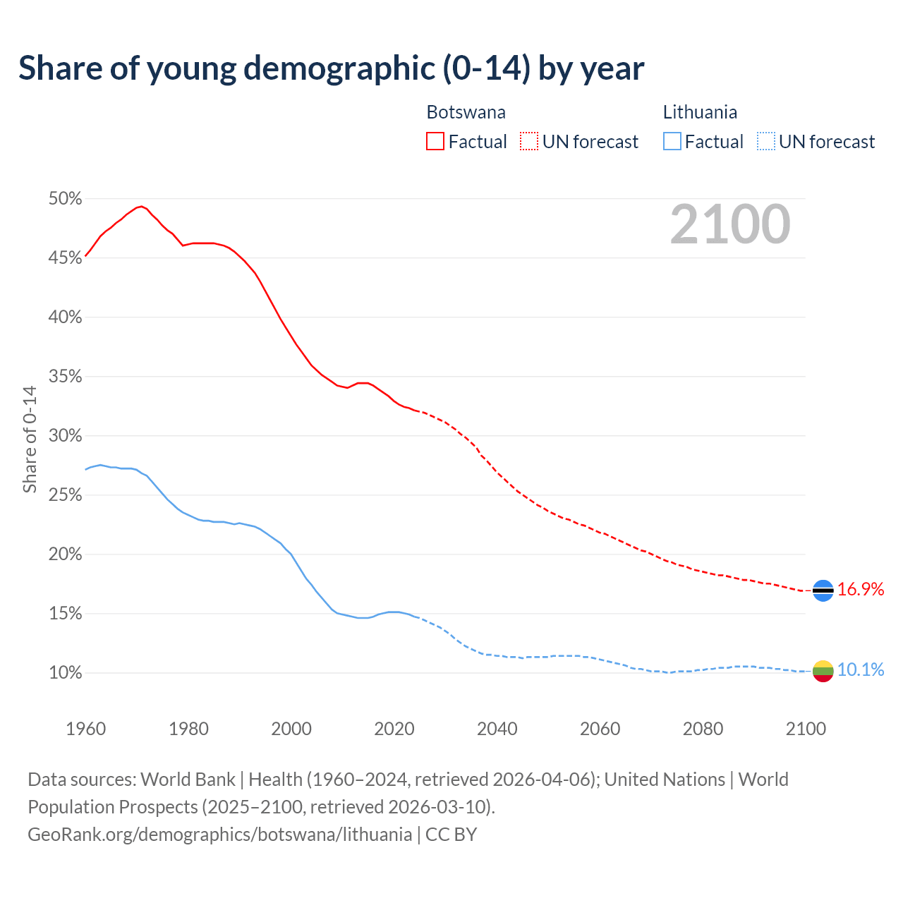 - The share of young demographic (0-15 years old) in Botswana is 32.1% vs 14.7% in Lithuania.