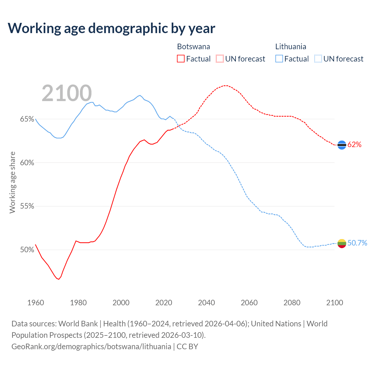 - Botswana has 1.67M working age adults (aged 15-64) vs 1.84M in Lithuania.