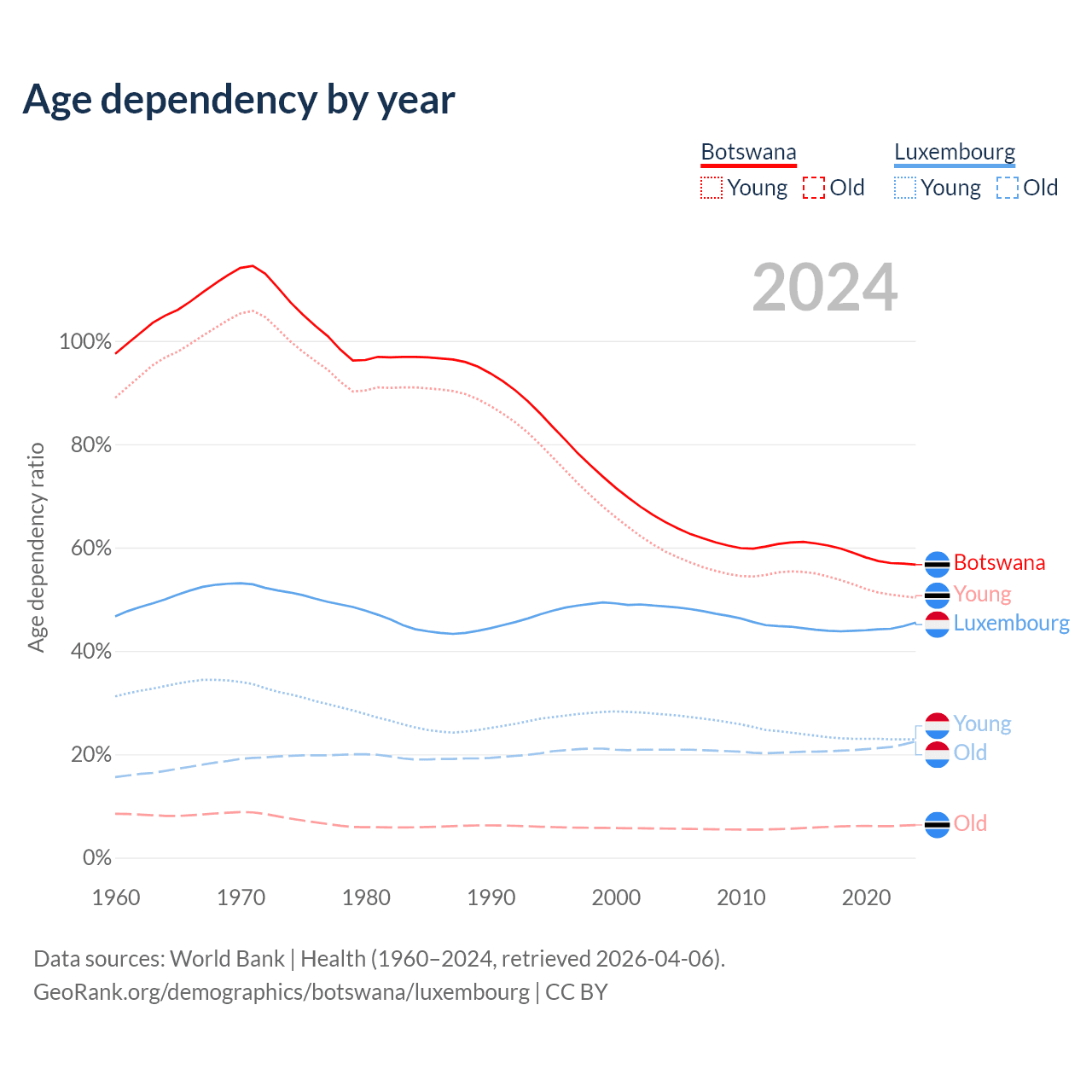 - The share of old-age demographic (65+) in Botswana is 4.04% vs 15.5% in Luxembourg.