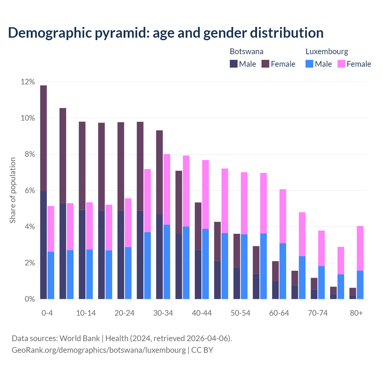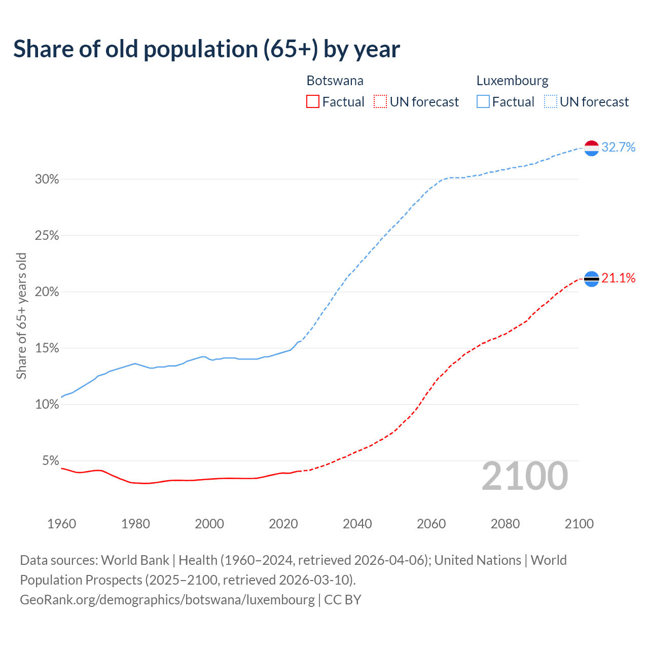 The share of older people aged 65 and over is 4.04% in Botswana and 15.5% in Luxembourg. Life expectancy in Botswana compared to Luxembourg .