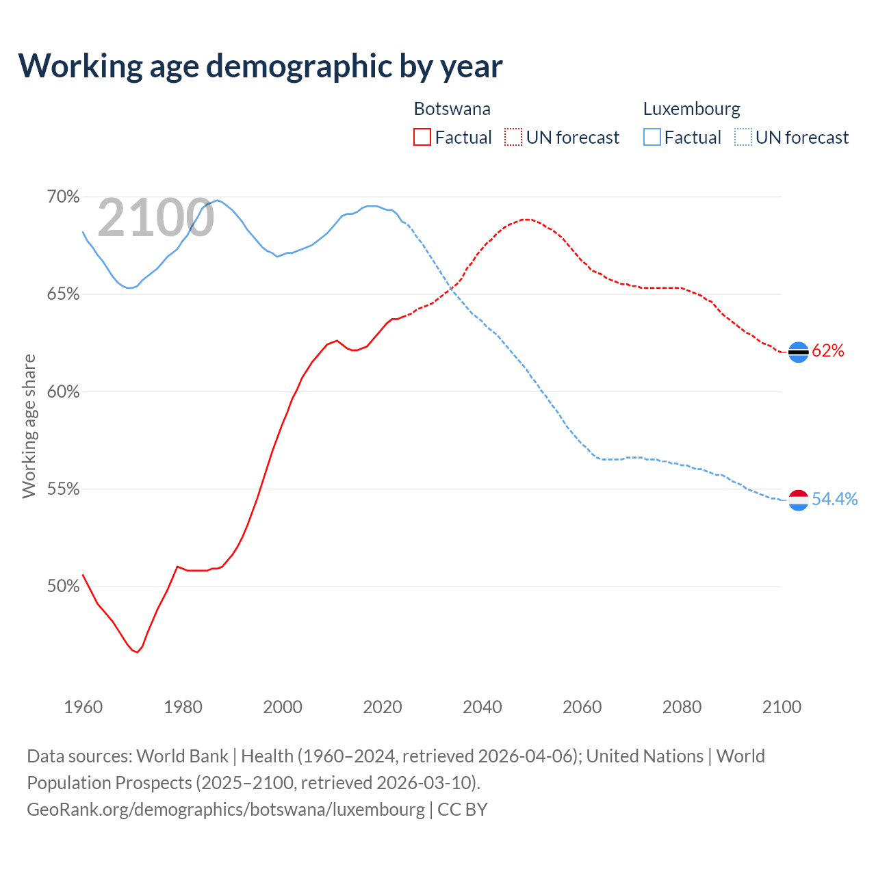 - Botswana has 1.67M working age adults (aged 15-64) vs 477K in Luxembourg.