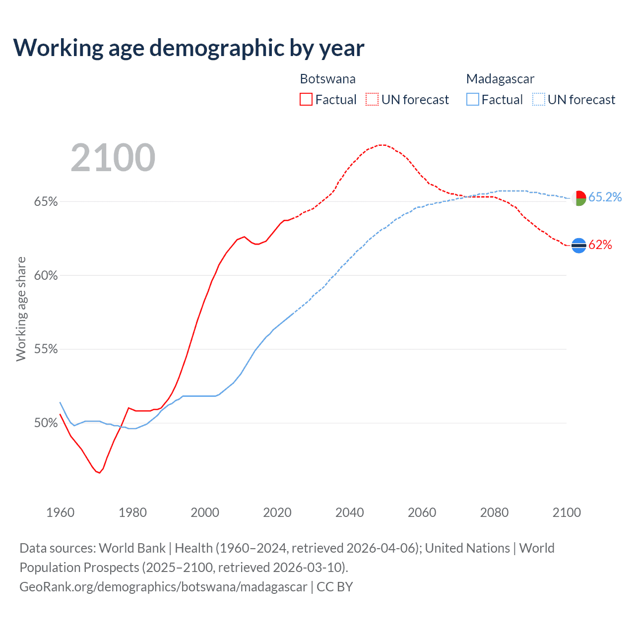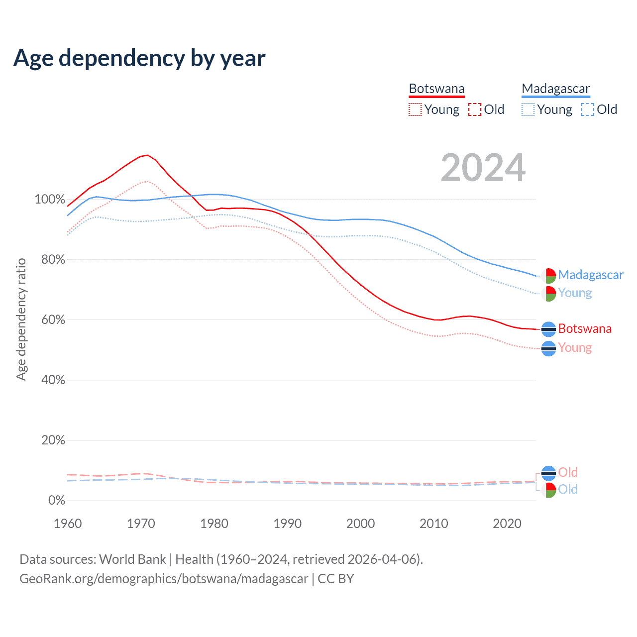 - The share of old-age demographic (65+) in Botswana is 4.04% vs 3.41% in Madagascar.