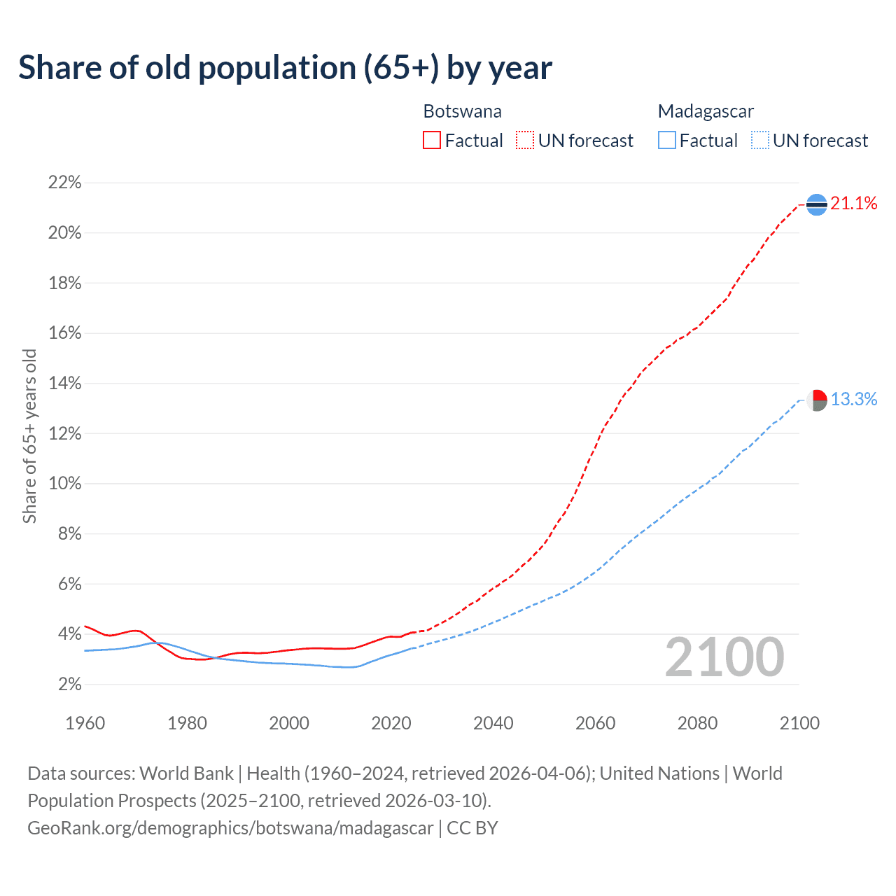 The share of older people aged 65 and over is 4.04% in Botswana and 3.41% in Madagascar. Life expectancy in Botswana compared to Madagascar .