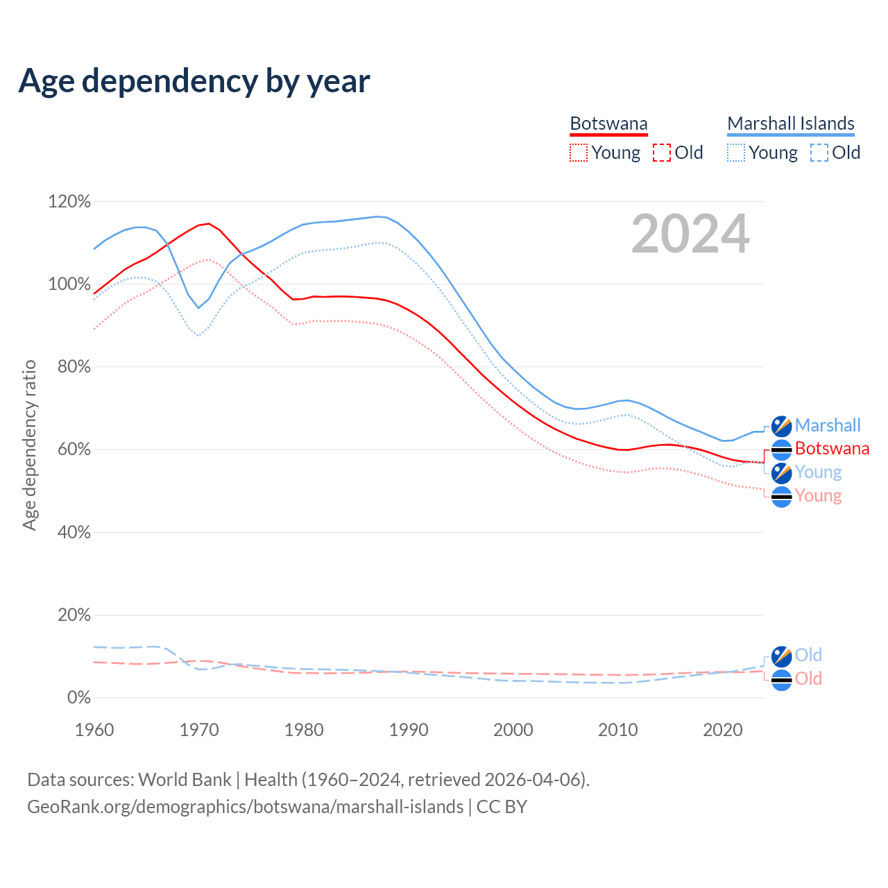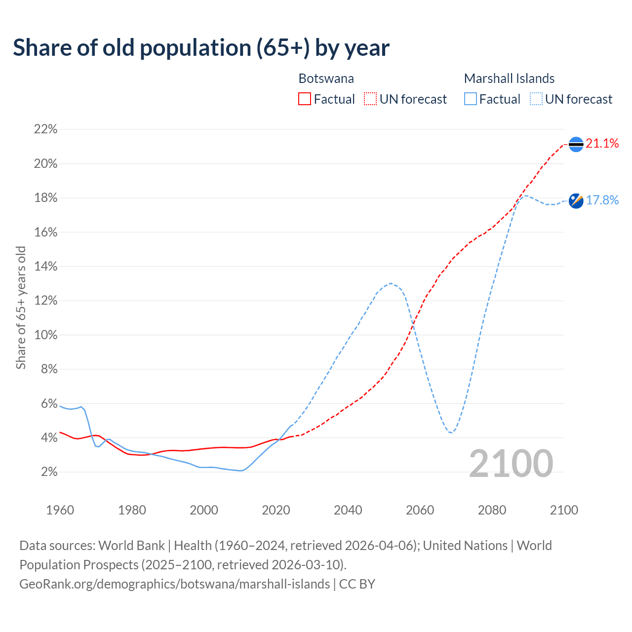 - The share of old-age demographic (65+) in Botswana is 4.04% vs 4.64% in the Marshall Islands.
