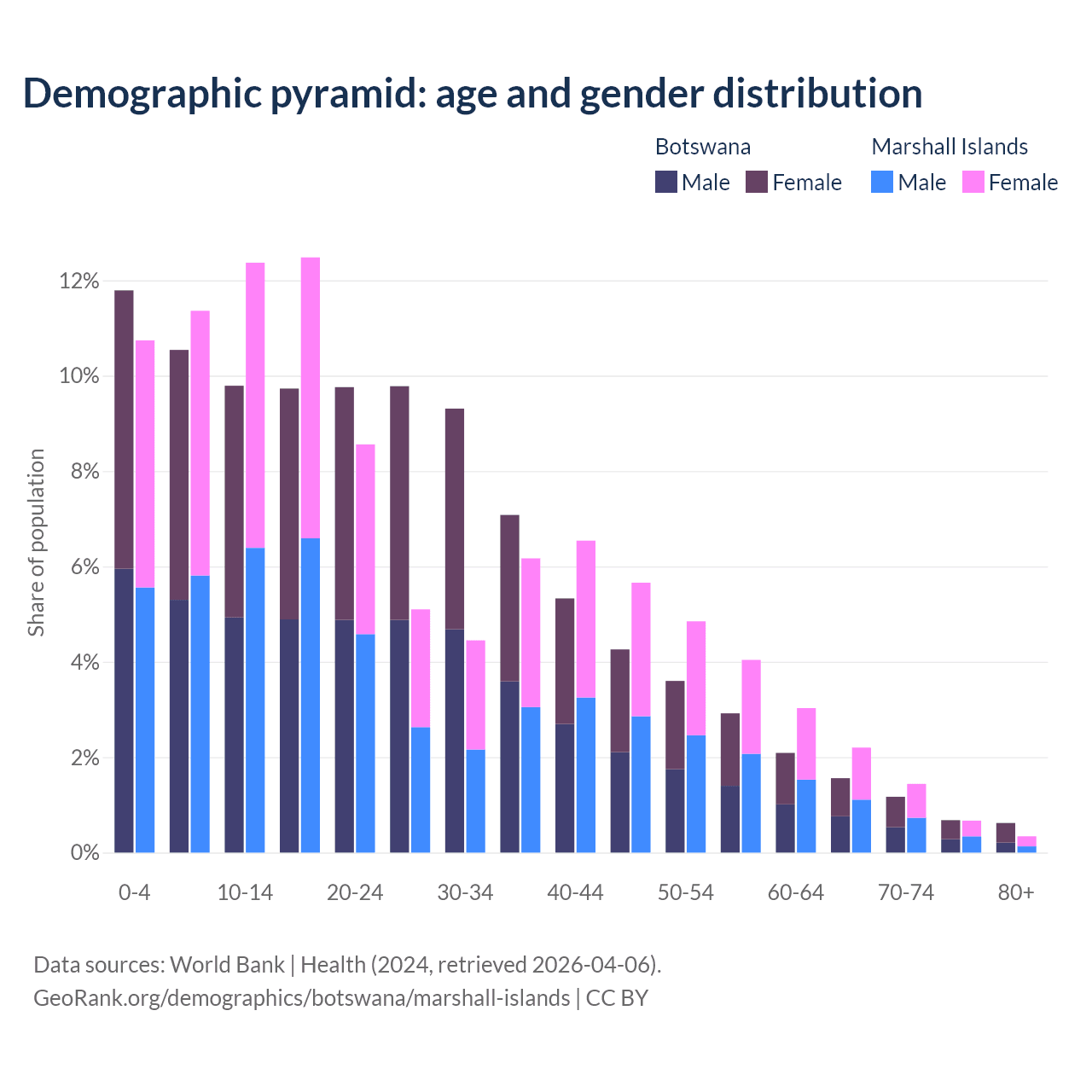 - As of 2026, the population of Botswana is 2.62M vs 35.1K in the Marshall Islands - 74.6 times difference.