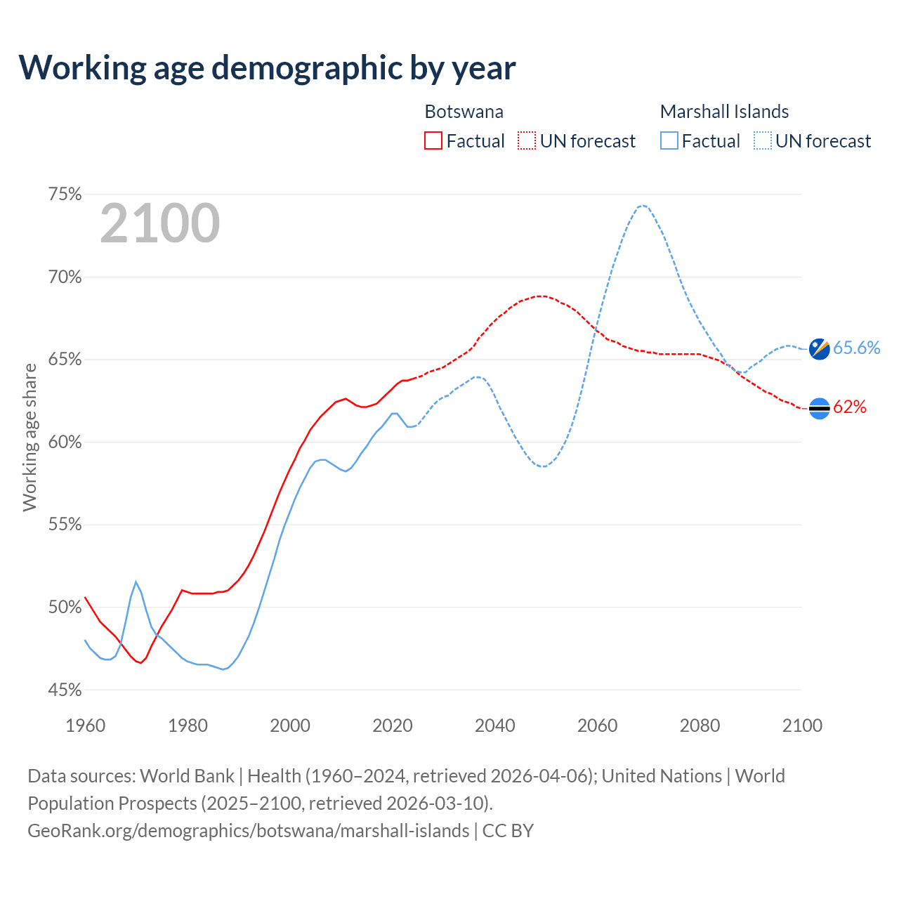 - Botswana has 1.67M working age adults (aged 15-64) vs 21.3K in the Marshall Islands.