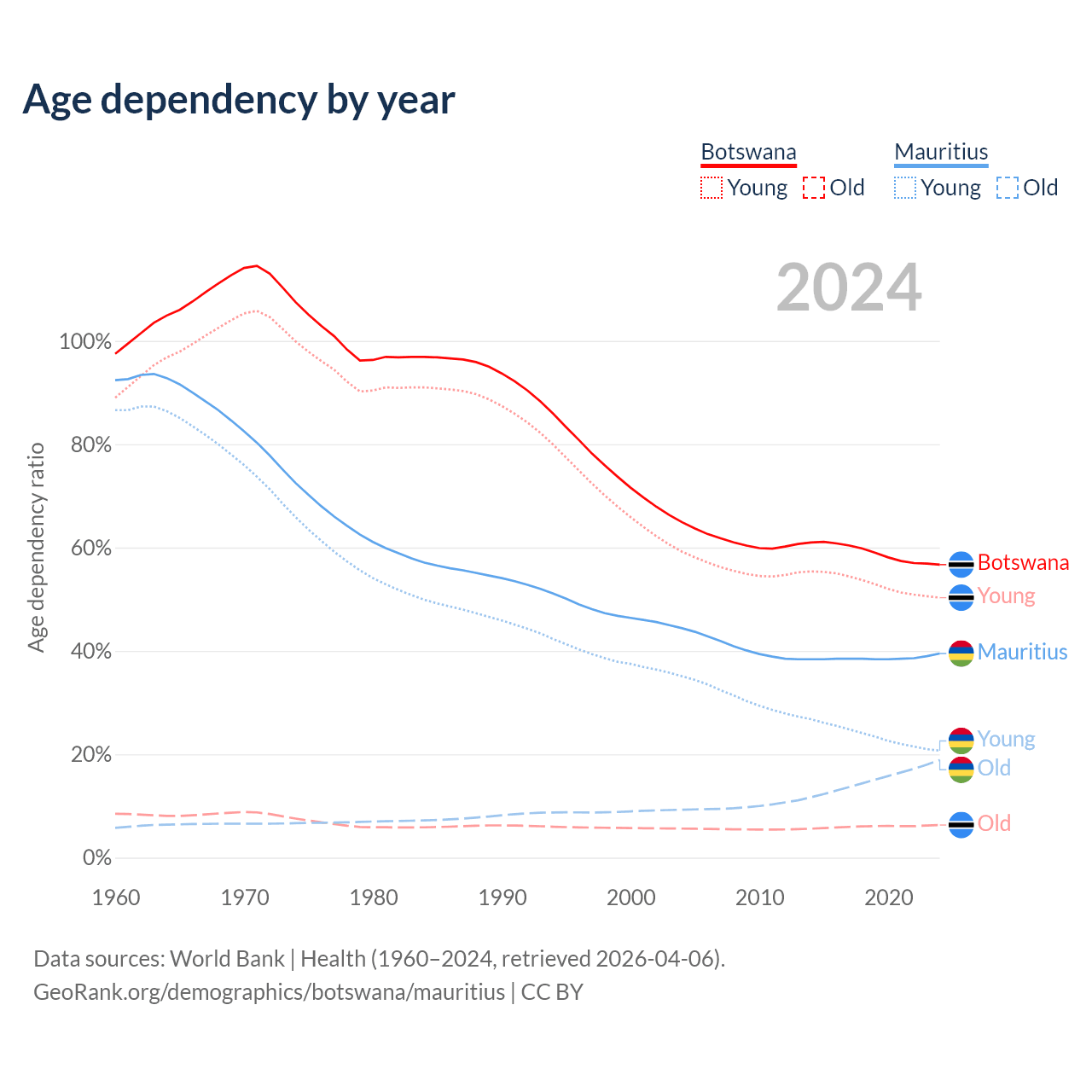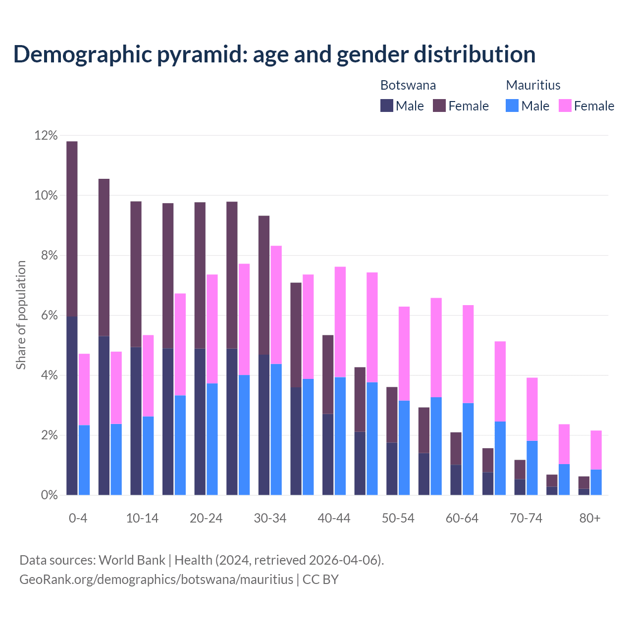 - Botswana is ranked 136/196 by median age (oldest to youngest) vs 57/196 for Mauritius.