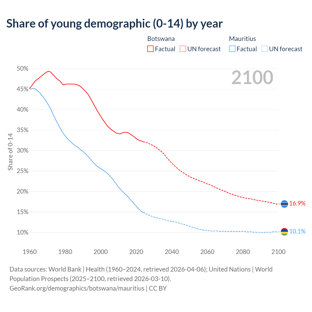 - The share of young demographic (0-15 years old) in Botswana is 32.1% vs 14.8% in Mauritius.