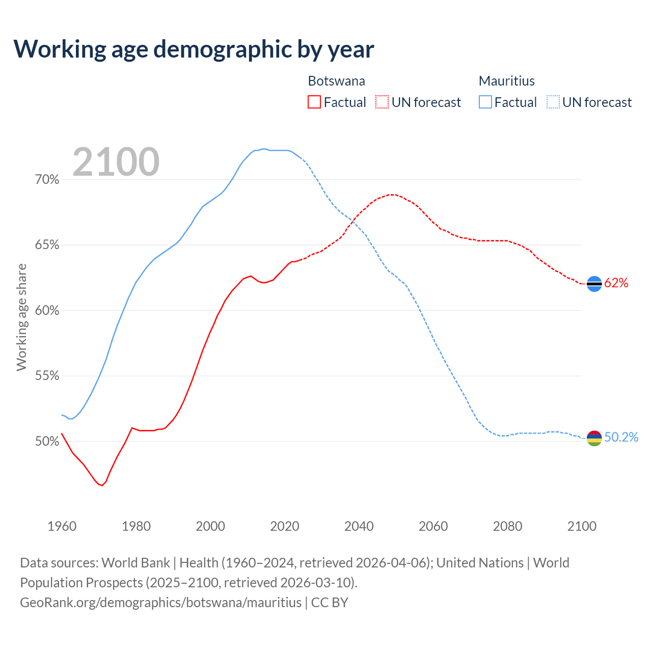 - Botswana has 1.67M working age adults (aged 15-64) vs 889K in Mauritius.