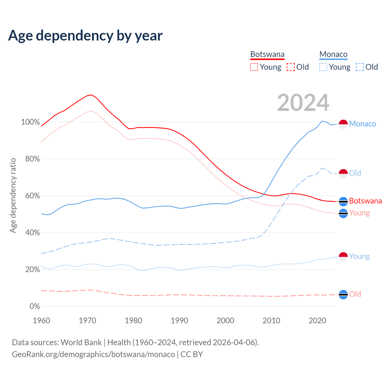 - The share of old-age demographic (65+) in Botswana is 4.04% vs 36.2% in Monaco.