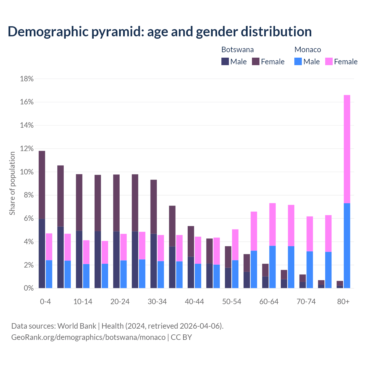 - Botswana is ranked 136/196 by median age (oldest to youngest) vs 1/196 for Monaco.