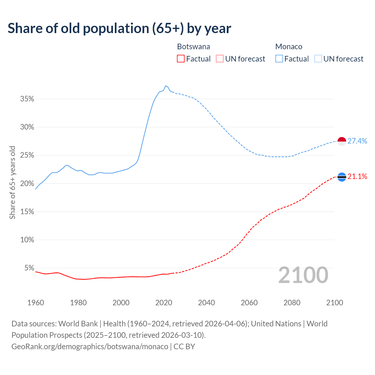 The share of older people aged 65 and over is 4.04% in Botswana and 36.2% in Monaco. Life expectancy in Botswana compared to Monaco .