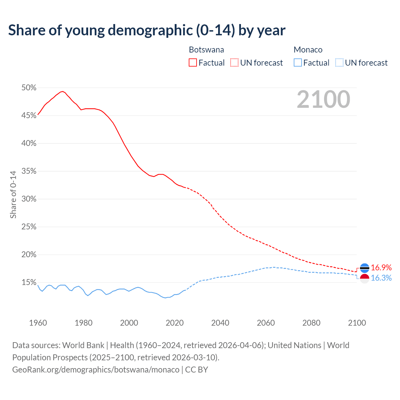 - The share of young demographic (0-15 years old) in Botswana is 32.1% vs 13.5% in Monaco.